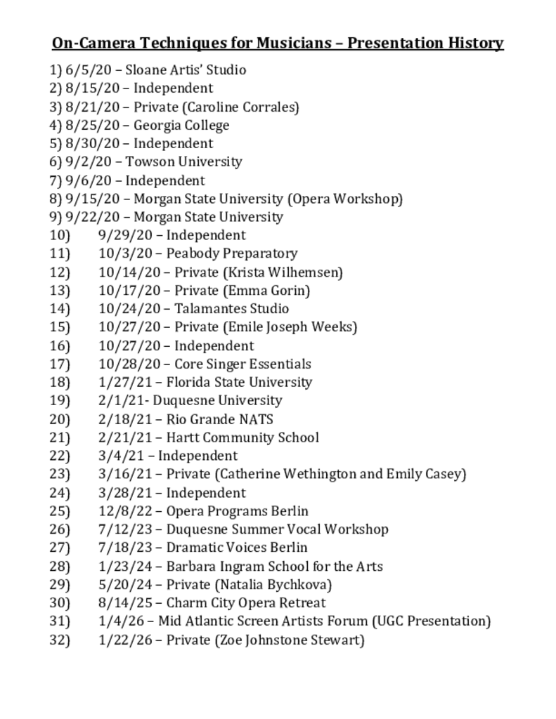 Topics discussed include everything from home studio set-up and recording equipment; to hair, makeup, and what to wear on camera; and how to perform for the camera without compromising technique. Since the summer of 2020, Ms. Gill has presented for several colleges throughout the entire United States, including Morgan State University, Towson University, Georgia College, the Peabody Preparatory Vocal program, Duquesne University, Florida State University, the Hartt School, and the Rio Grande division of the National Association of Teachers of Singing (NATS). Additionally, Ms. Gill has presented for one-on-one coachings, and for independent musicians and private studios. To date, Ms. Gill has given her "On-Camera Techniques for Musicians" presentation over thirty times (and counting).