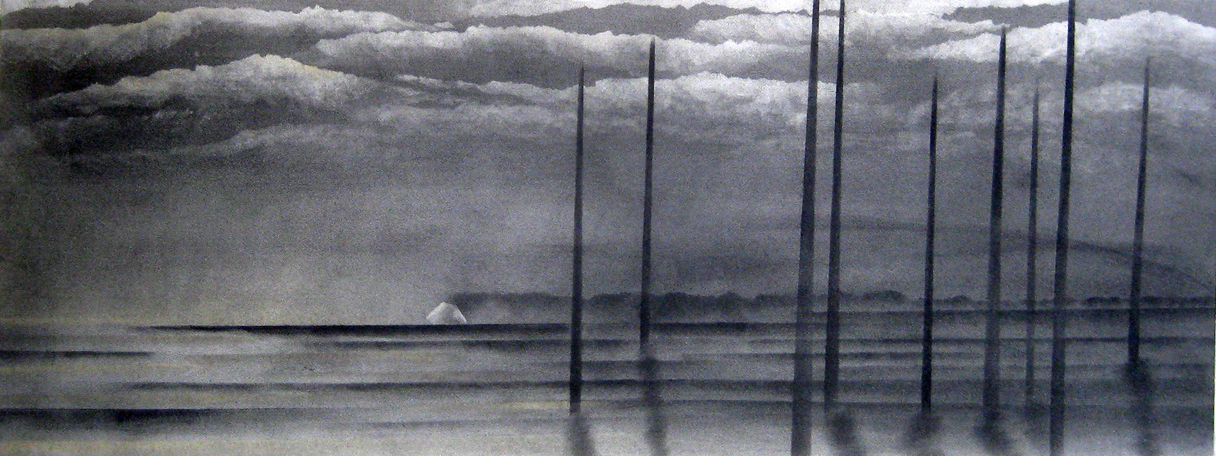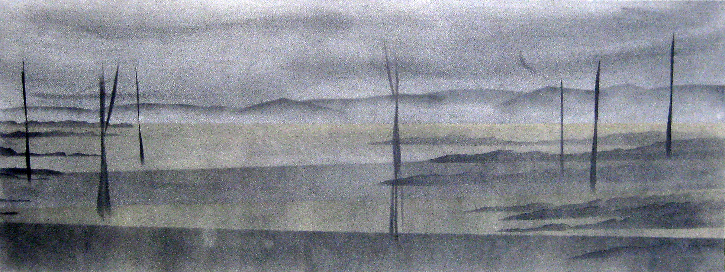 Site Sketch 2 - Bayou BartholomewBayou Bartholomew: site re-imagined with a chapel on the horizon. Medium: conte & charcoal on newsprint -