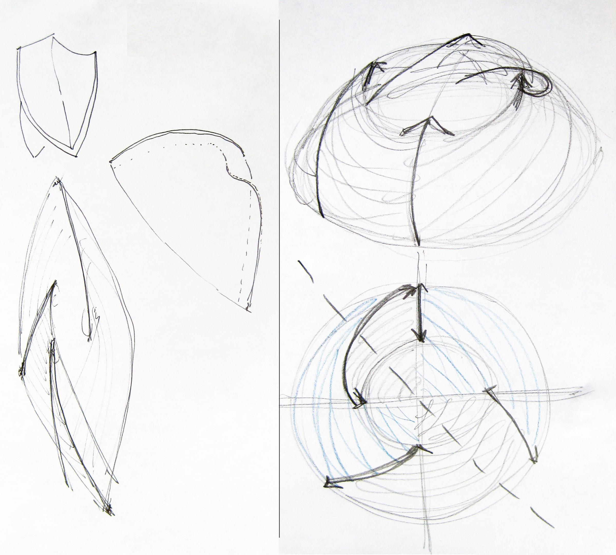 Base molds are used to build variations of a shape. I cut out a pattern from the clay slab and drape it over the base mold, usually attaching one or two joints that are incorporated into the form. When the base has stiffened, I remove it from the mold and begin building upward or outward with slab walls. The joints give me a starting point for the forms directionality. Sometimes, I pause construction to test ideas through sketching. Each previous wall informs the next as the shape evolves throughout the building process.
