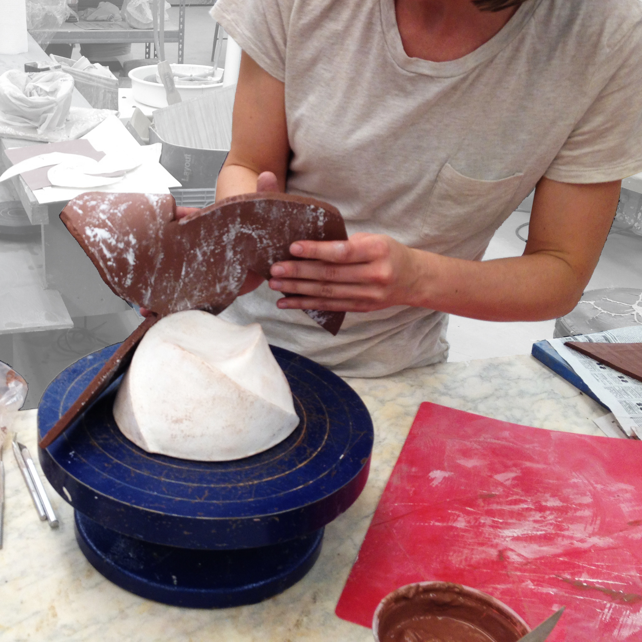 Initially, I invest time in the design of base molds, a thick-walled clay form that serves as a support for slumping clay slabs into the same shape. This shape becomes the base of sculptural forms, which can vary as more clay is added above the base.
