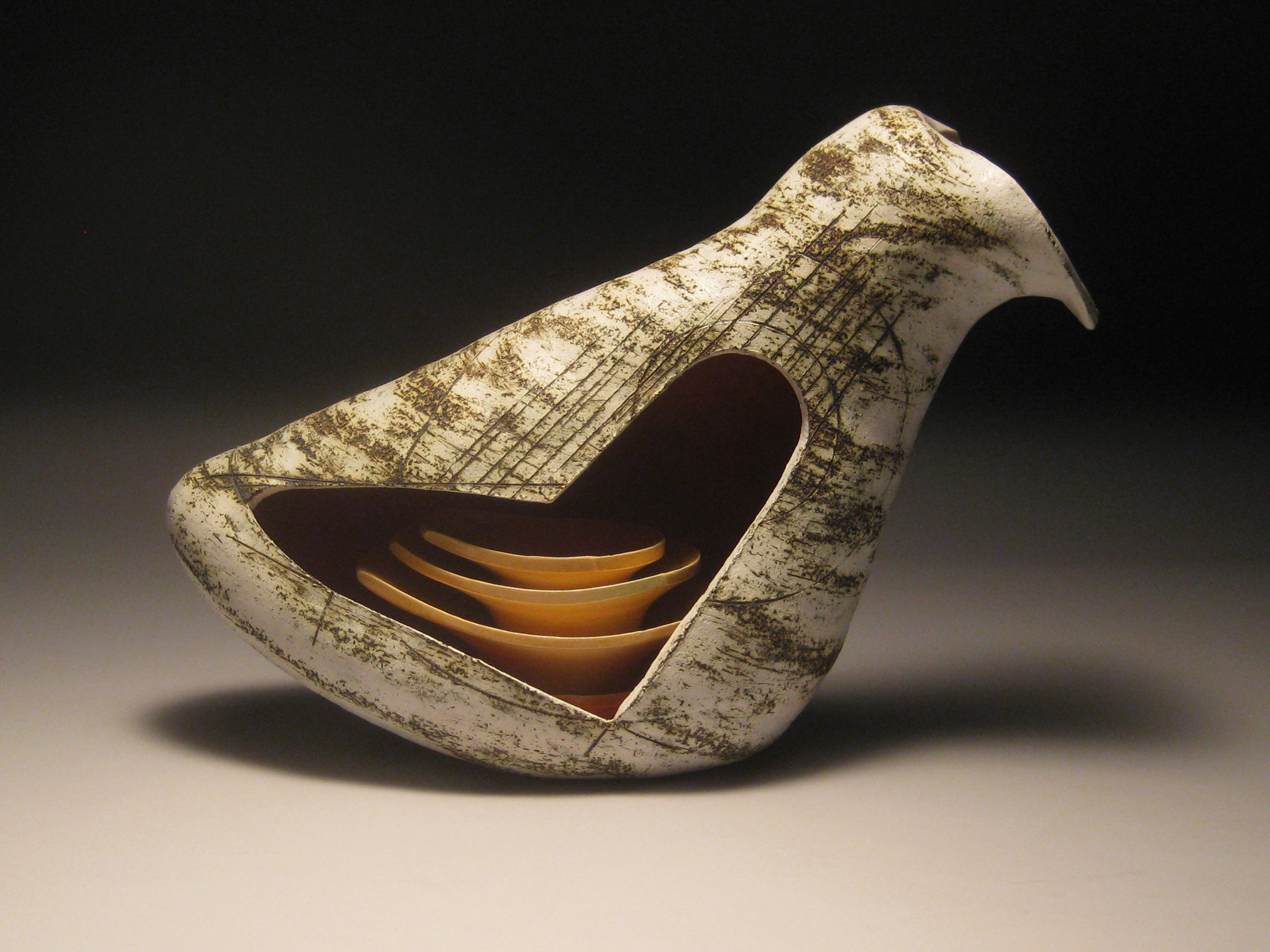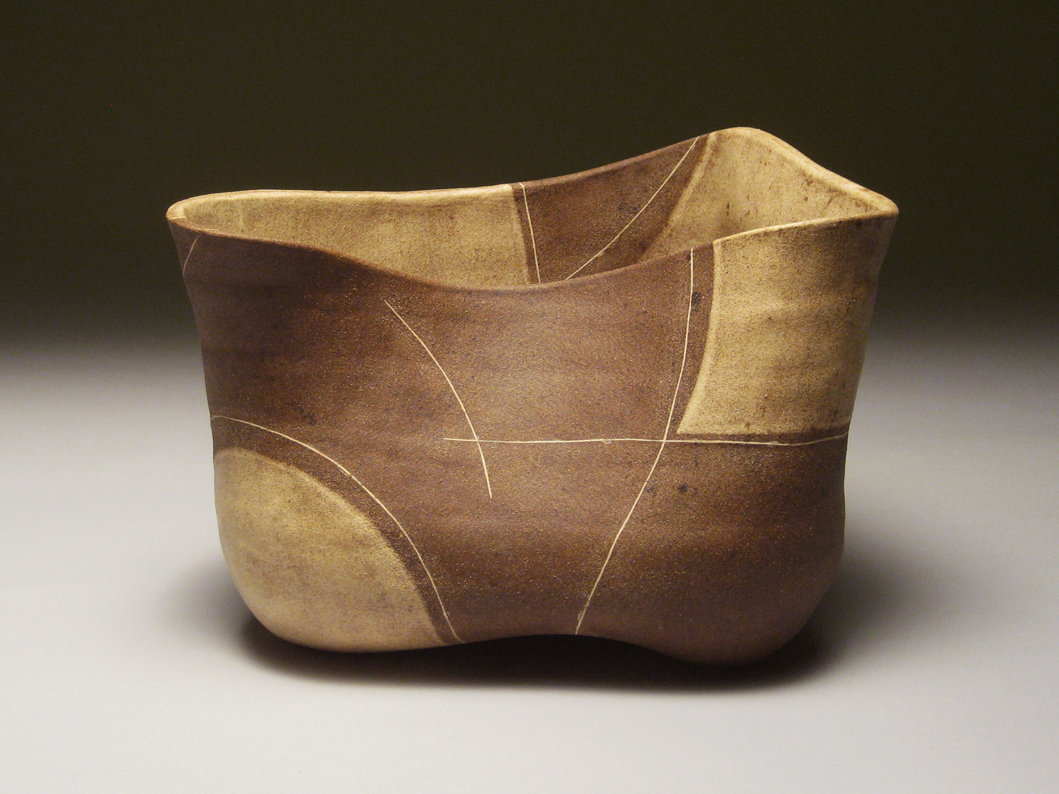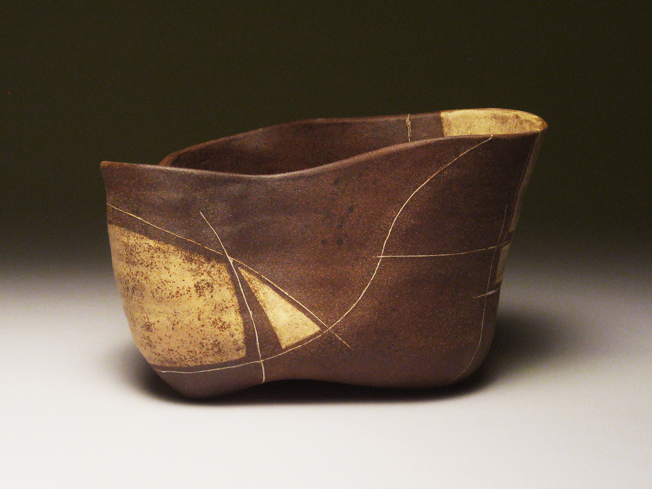 I incorporated lines to enhance and define the geometry. I also used lines to trace the topography of the vessel. I began experimenting with thin, skin-like slips and finishes, rubbing stain into the surface to create patinas.