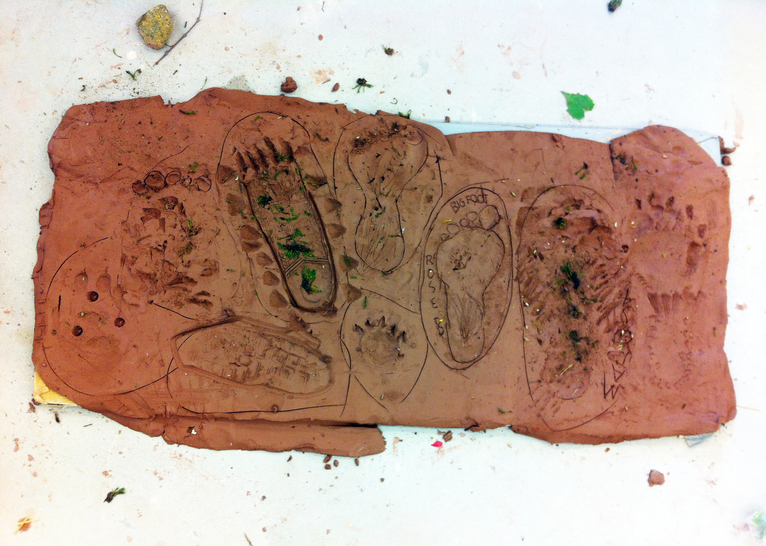 Group Project - Monster PrintsThe monster theme of this week-long summer camp opened up countless imaginative possibilities. At the end of the week, students spent time outdoors collecting found object stamps and mark-makers. They then constructed a giant slab from clay scrap and used these objects and their own footprints to make Monster Prints. This group project encouraged a lot of interaction and exploration after a long week of solo projects. -