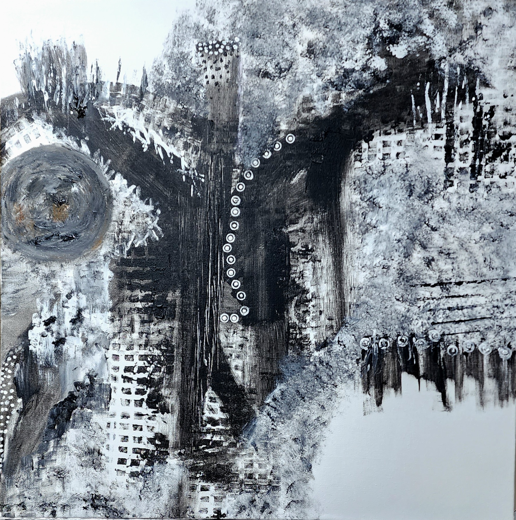 My Urgent MindIn realizing my mortality, my mind and soul want to do, learn, be all that I can in the time I have. My Urgent Mind, acrylic and paper on canvas, 36x36, 2021