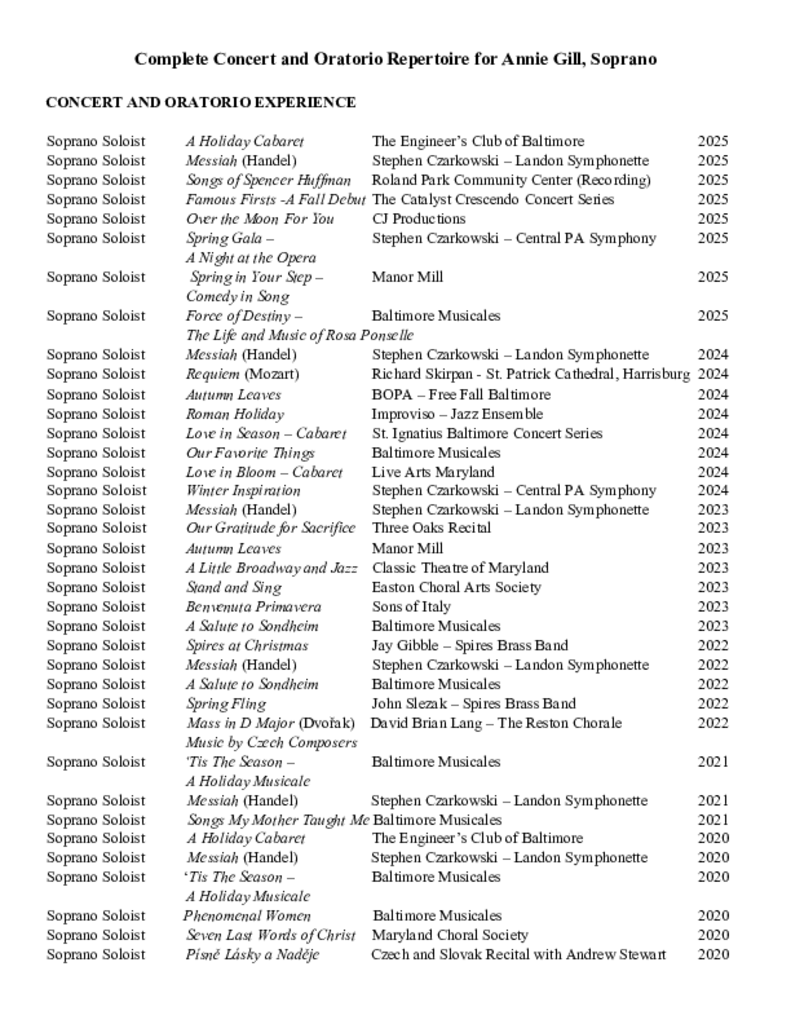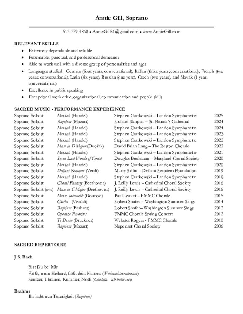 With a flexible voice than can transition between the agile singing of Handel and Mozart, and the more dramatic demands of Verdi's works, Ms. Gill has an ever-expanding list of concert and sacred music credits. Performance highlights include Soprano Soloist in Verdi's Requiem with the Defiant Requiem Foundation; multiple performances as Soprano Soloist in Handel's Messiah with the Landon Symphonette; Soprano Soloist in Mozart's Requiem at St. Patrick's Cathedral in Harrisburg, PA, and Second Soprano Soloist in Beethoven's Choral Fantasty with the Cathedral Choral Society.
