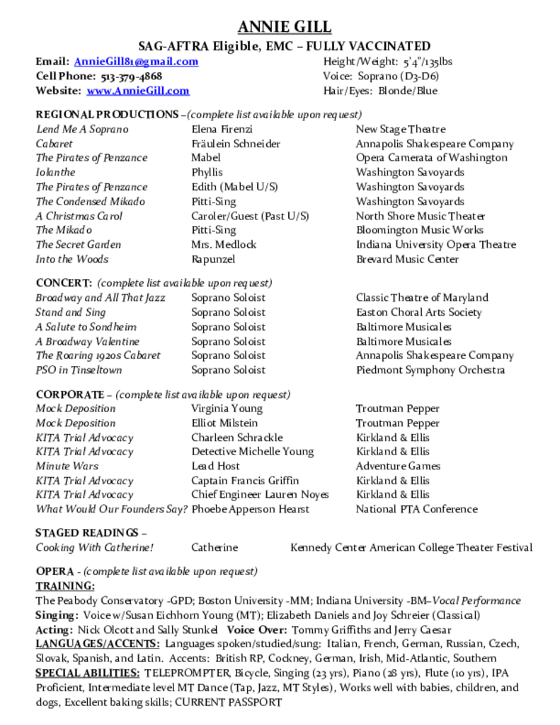 In addition to her classical singing career, Ms. Gill is an actress and voice over artist whose work spans many genres including film, television, theater, industrials, and commercials.