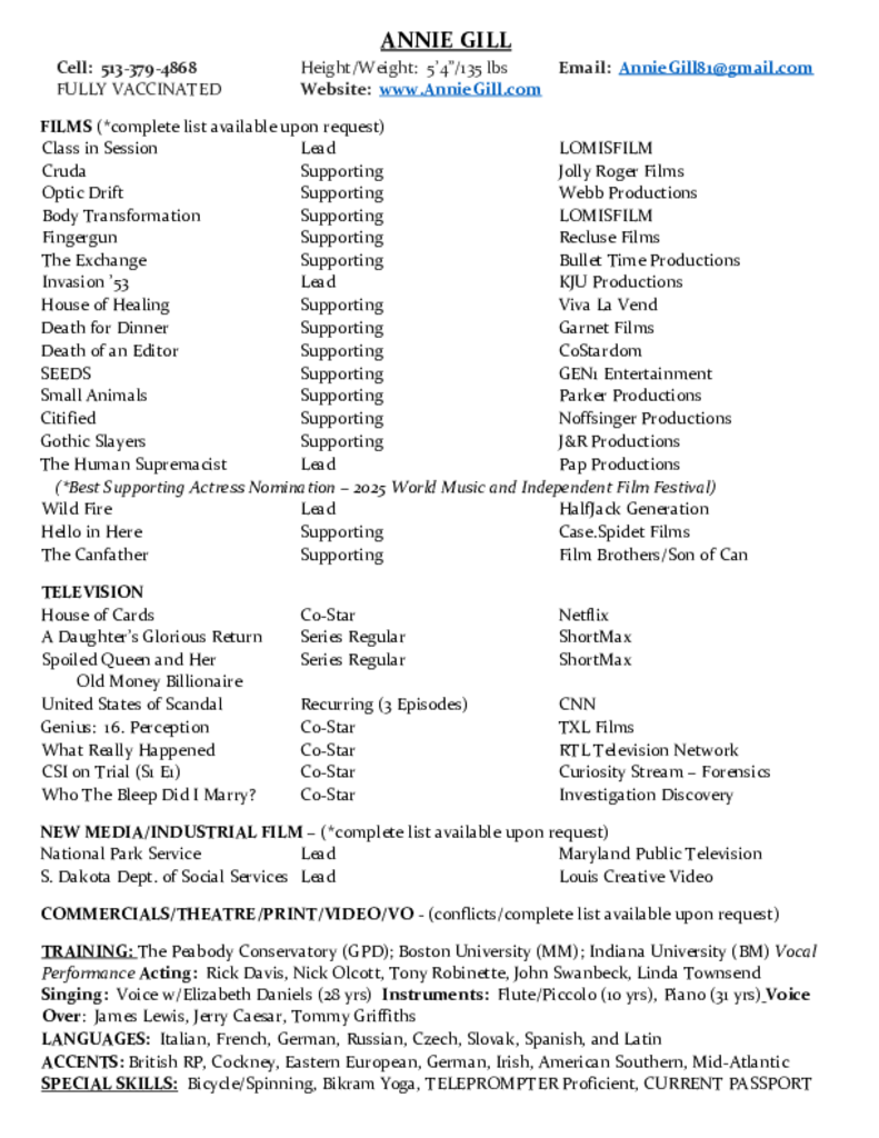 After landing the role of the Opera Singer in the season two finale of House of Cards, Ms. Gill expanded her career to include film, television, and commercials. She has since appeared in over twenty feature and short films, including the award-winning feature Wild Fire (Maeve), the popular thriller Death 4 Dinner (Katrina Rutherford), the genre-defying psychological thriller The Human Supremacist (Dahlia *Best Supporting Actress Nomination), and the horror-comedy Gothic Slayers (Ben's Mom). Television credits include United States of Scandal on CNN, Vaughn Recreation (Kim Vaughn) Curiosity Stream - Forensics, What Really Happened (Paige Birgfeld) RTL Television Network, and Who The Bleep Did I Marry? (Kathleen) Investigation Discovery. With over eighty national, regional, and local commercial credits, highlights include Big Lots, Royal Sonesta, Forte Construction and Design, West Shore Home, Little Treasury Jewelers, and Roadway Moving. Notable industrial credits include military films for Rock Creek Media and Rocket Media, Management Gaps (Kim) OTS Management, Facing Change (Nurse Jill Sheridan), and Diversity and Inclusion (STSO Michell) TSA/General Dynamics.
