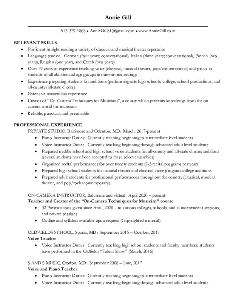 Ms. Gill is also a sought-after teacher of voice and piano, with over twenty years of teaching experience. She holds degrees from Indiana University (BM), Boston University (MM) and the Peabody Conservatory (PD). Ms. Gill currently teaches out of her home studio in Towson, MD, and joins the faculty at Stevenson University for the Spring Semester in 2026. Although in-person teaching was suspended at the onset of the pandemic in March, 2020, Ms. Gill's studio remained active online through virtual lessons and virtual recitals via Zoom. Today, Ms. Gill offers both in-person and virtual lessons, where she is able to teach students throughout the greater Baltimore area and beyond.