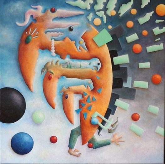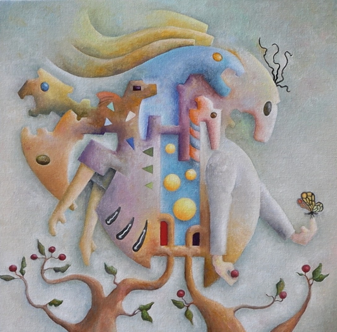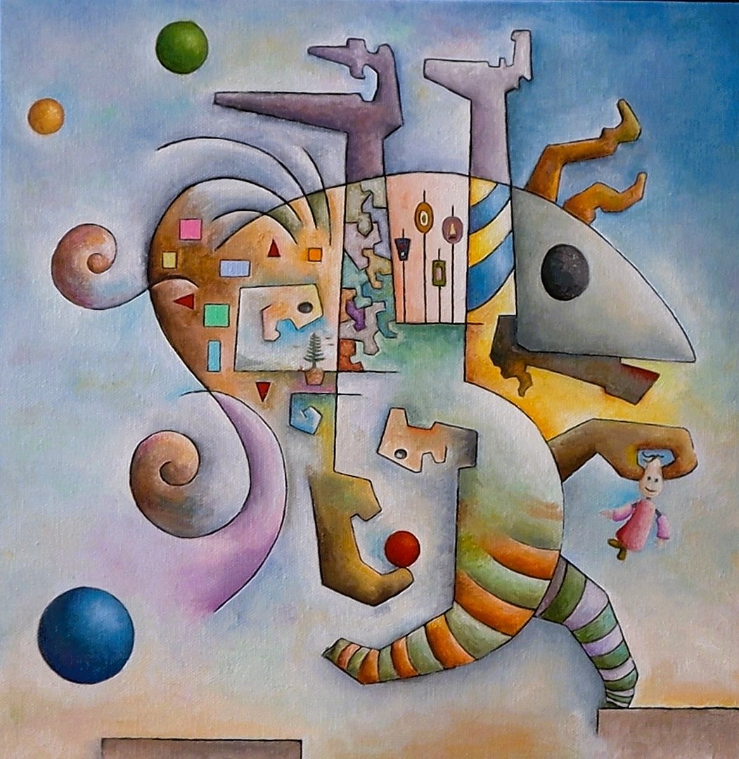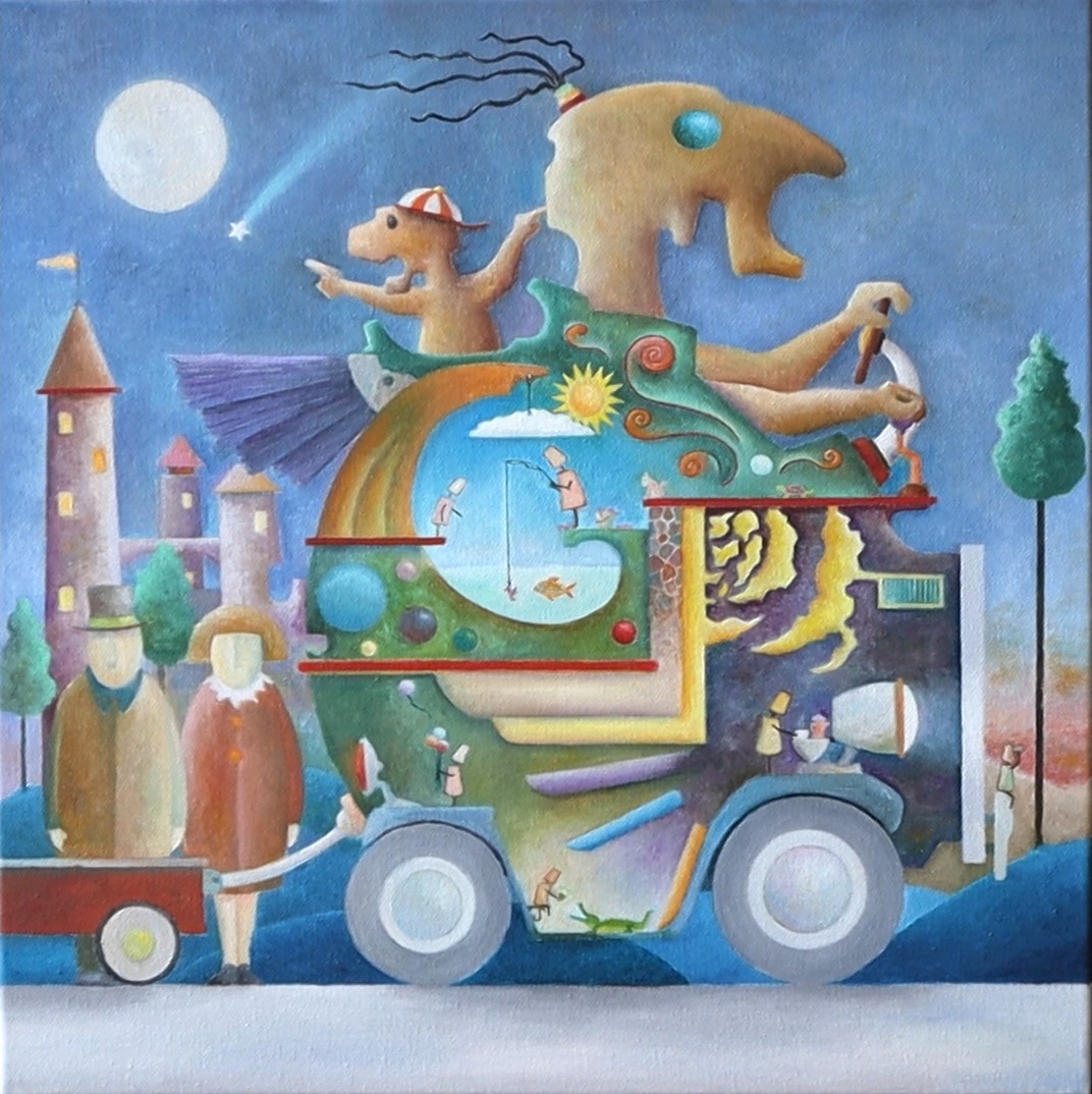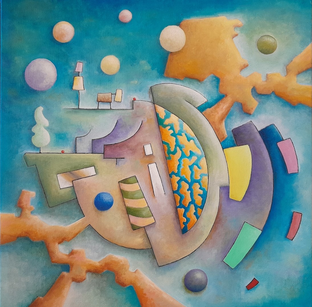 This 14 x 11 was started five years ago and put aside because of a design issue. Later decided to rework it as a 10 x 8 and on the top left and right horizontal ‘pipe connectors’ I used the surface as a road and created a small entrance/exit at each lower side of the bodies and added some vehicles (1/8 inch in height) travelling in and out. Last year I reviewed the unfinished 14 x 11 and came up with a solution to my design issue and finished the painting as it was intended but didn’t add the tunnels I had used in the 10 x 8 painting. Hence the title, ‘No Tunnel’