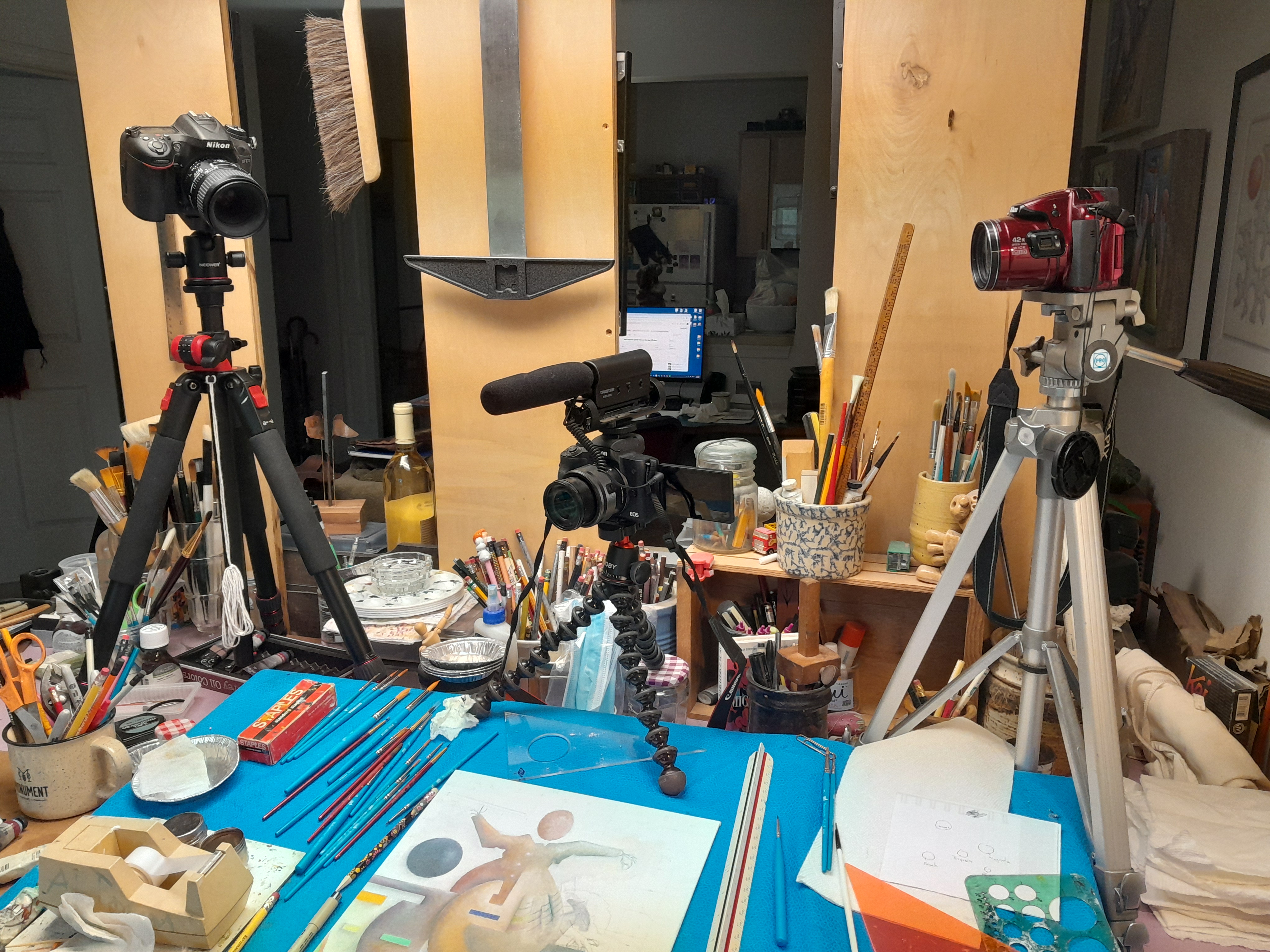 Cameras for Filming Art content videos.jpgOnce an art subject has been chosen and then scripted for the current video, staging areas for filming are then considered the videos. Most filming areas are within my primary work area for art. On the smaller tripod (center) is the Canon M50 digital film camera used for all my main filming. To the left is newly acquired Nikon D7100 digital camera (replacing no longer operational Nikon D80) for additional filming so that the M50 can stay in a set position if replacement takes are needed. To the right, there is a Nikon Point & Shoot on the silver tripod, gifted to me and can be used for backup still and film shots. Also used is the 'smartphone' for extra still shots such as this one.