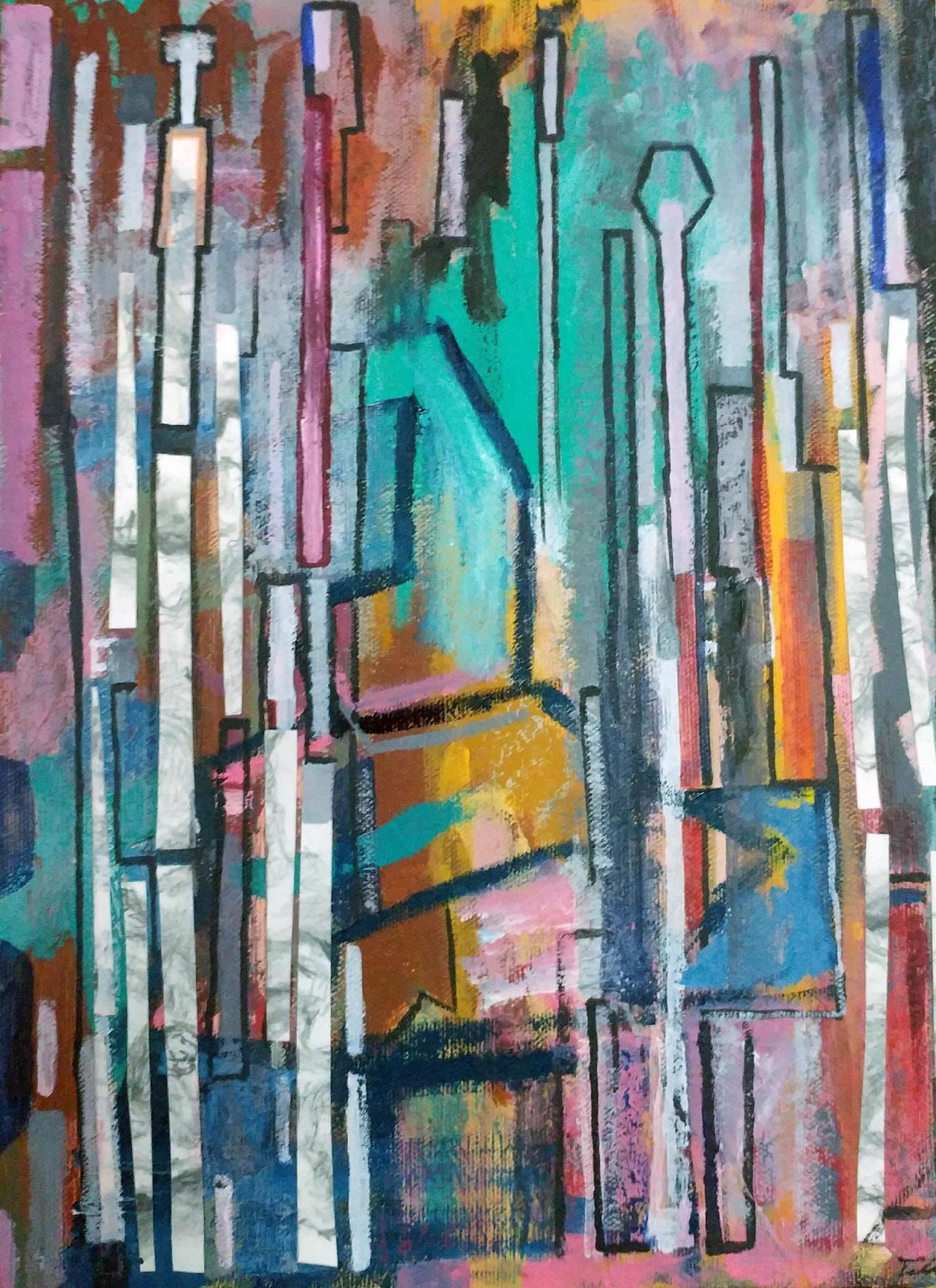Traces of Self is a series of abstract acrylic paintings created over a year amongst my high school art and design students, working on them in small increments in our art and design classroom, and using leftover paint the students no longer wanted. During the painting process, while everyone was working, I actively engaged them and asked questions about my own work, seeking their critique and insights, just as I would with their work. It is a way to connect with my art students, so they can see what I do as an abstract artist and as an entry point to discuss abstract expressionism and inner emotional life.