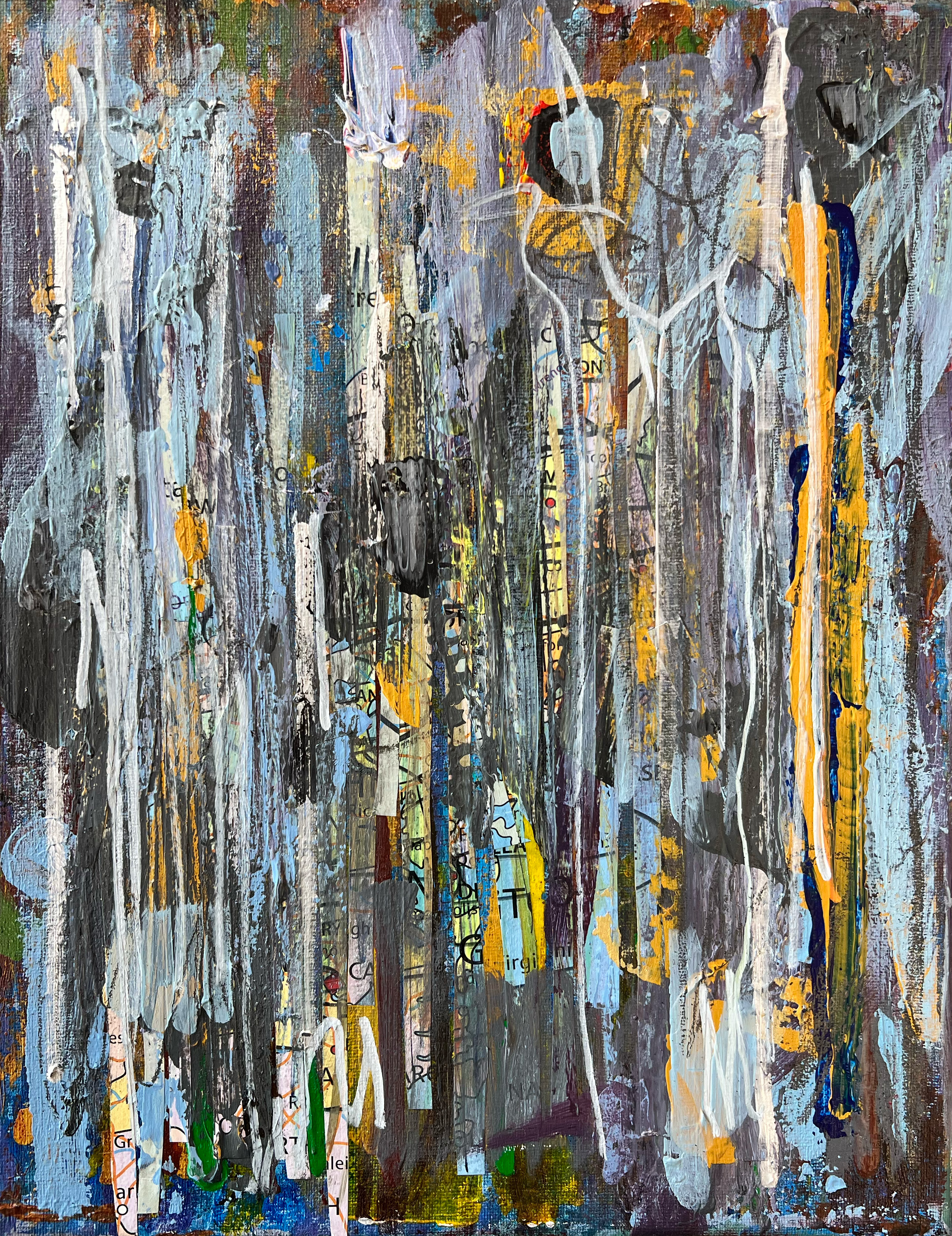 Dispersed Together is a series of abstract mixed-media works created in response to the COVID-19 pandemic. These paintings explore this global crisis in various ways—how individuals were separated in their own communities, police brutality in America, wide spread grief and loss, and more.
