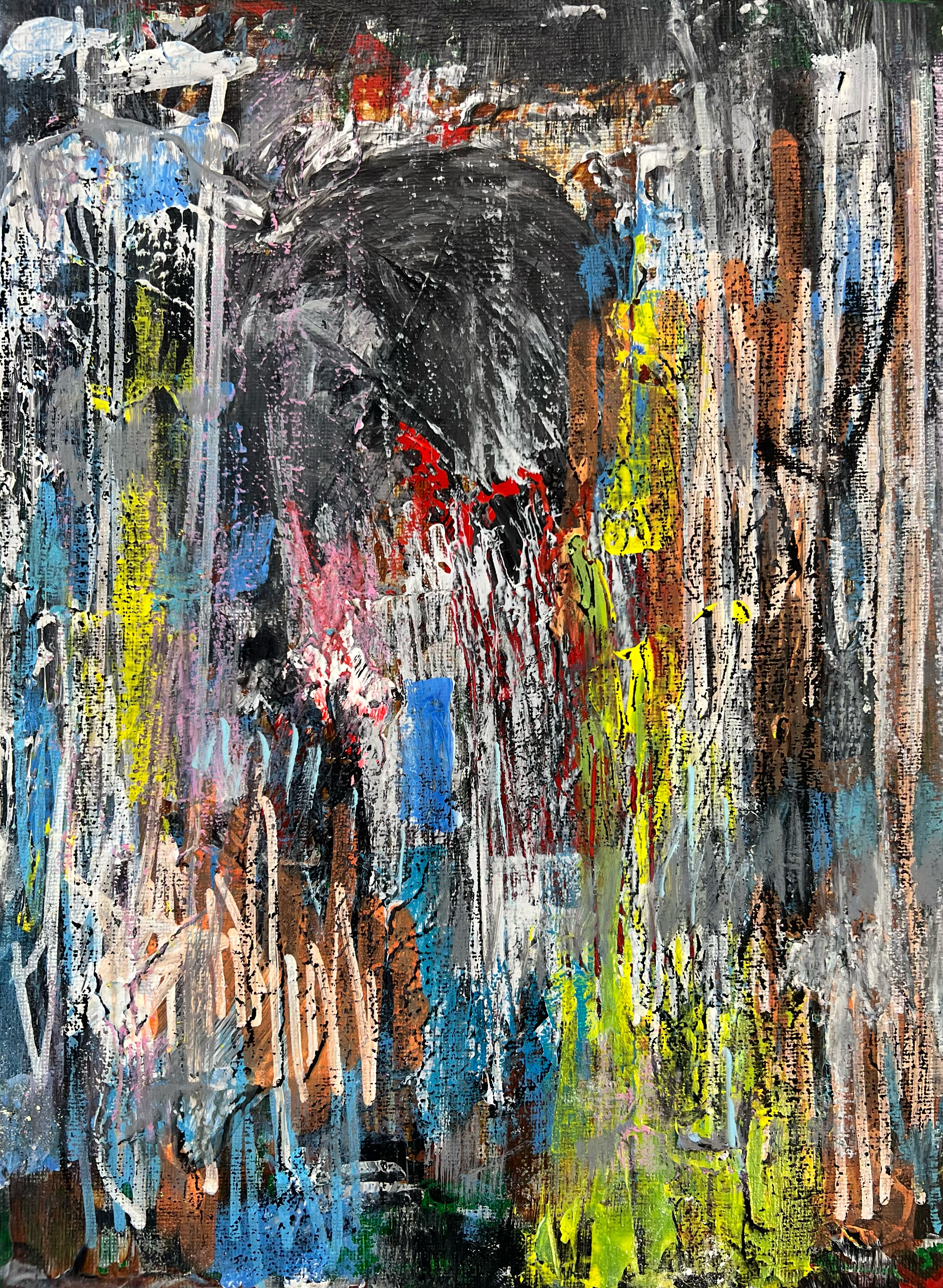 Traces of Self, 2025, is a series of abstract acrylic paintings created over a year amongst my high school art and design students, working on them in small increments in our art and design classroom, and using leftover paint the students no longer wanted. During the painting process, while everyone was working, I actively engaged them and asked questions about my own work, seeking their critique and insights, just as I would with their work. It is a way to connect with my art students, so they can see what I do as an abstract artist and as an entry point to discuss abstract expressionism and inner emotional life.