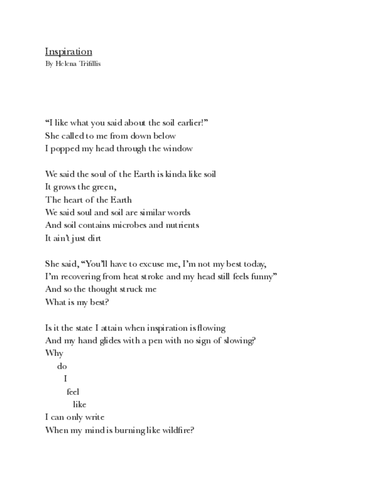 I was volunteering at the Krishna Village in Murwillumbah, NSW, Australia. I learned so much there and attended a yoga class every day. For once in my life, I could just exist without feeling the pressure to be working towards something. For the first few weeks this was great, my body and nervous system needed the rest. Then I began to feel as though I had no passions in life. I knew I loved writing but I had gotten into the habit of only writing when I was inspired and no inspiration was coming. I had just seen a video of a Lana Del Rey poem and one of the lines said something about writing at the same time every day so inspiration knows where to find you. I realized that as a writer, I didn't do enough of the "writing just to write" practice. One day, I was working on building a bamboo shed with Runnadeer, one of the Krishna devotees, and we were discussing spirituality in the garden when we realized that soul and soil were similar words!