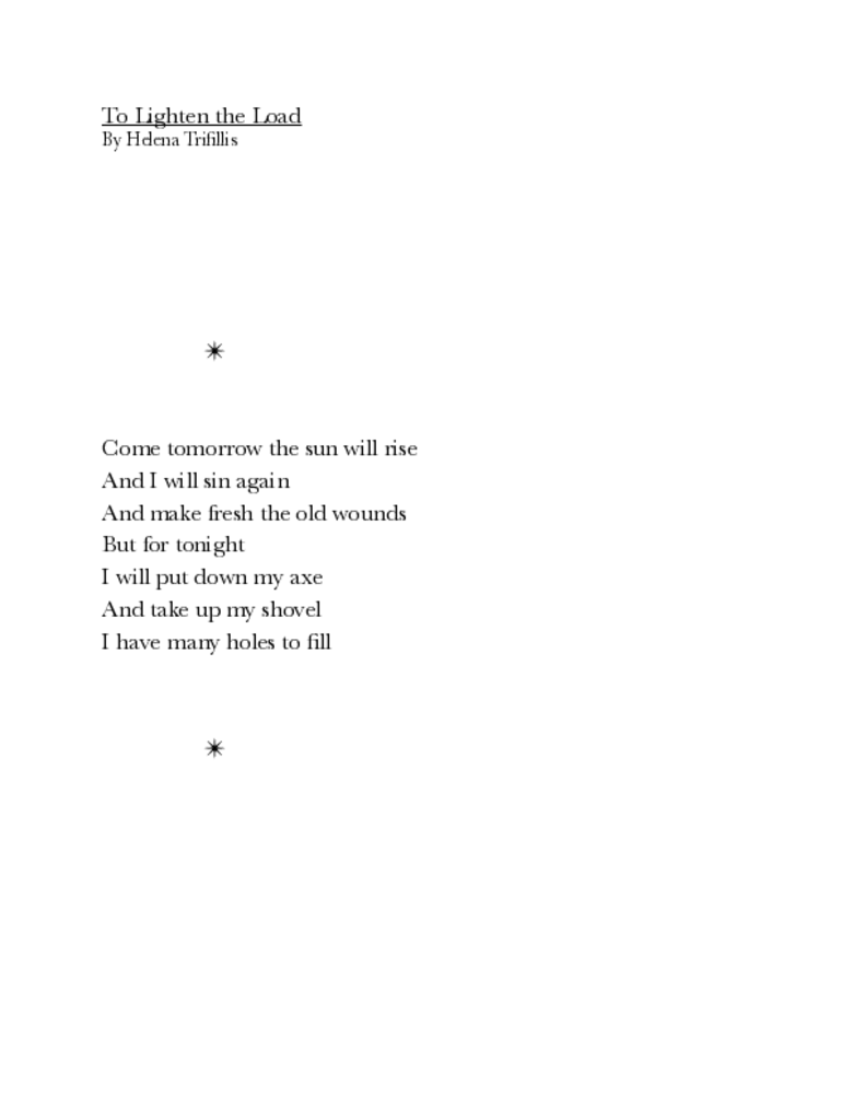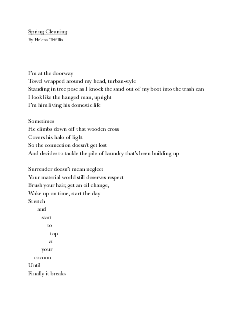 This poem references the Hanged Man tarot card. In the Rider tarot deck, this card depicts a man dangling head down from a wooden post, tied up by one leg while the other leg is bent behind, forming a figure 4. He has a halo of golden light around his head. I wrote this poem on the day that I decided to clean out my car. I had been living in my car in Australia and my back seats had become so piled up with my belongings, I could barely sleep on my makeshift mattress pad bed. My car also had mold on the seats. I was doing my laundry after taking a shower so my hair was wrapped in a towel turban and I was standing in tree pose knocking the sand out of my boot into a trash can. I was struck by how much I resembled the Hanged Man. For me, it's a constant balancing act between being a spiritual being living in my own world of signs and synchronicities and being a human living in physical reality.