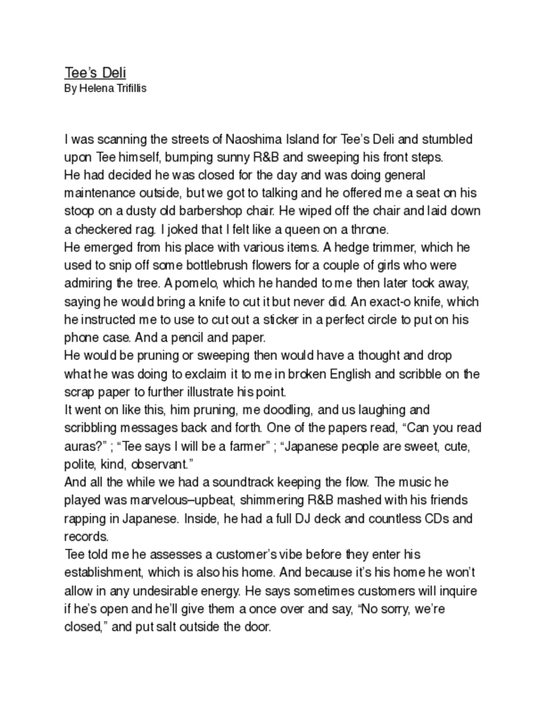 I visited the “art island” of Japan, Naoshima. It was off-season I suppose, so hardly any of the numerous restaurants on the island were open. I had found Tee’s Deli on Google Maps but when I arrived the restaurant was boarded up. Tee himself was outside sweeping and I inquired if he was open. In broken English he told me something about the steep price of rice these days and how it was not financially worth it for his deli to be open at this time. We got to talking and the rest is documented in the story above.