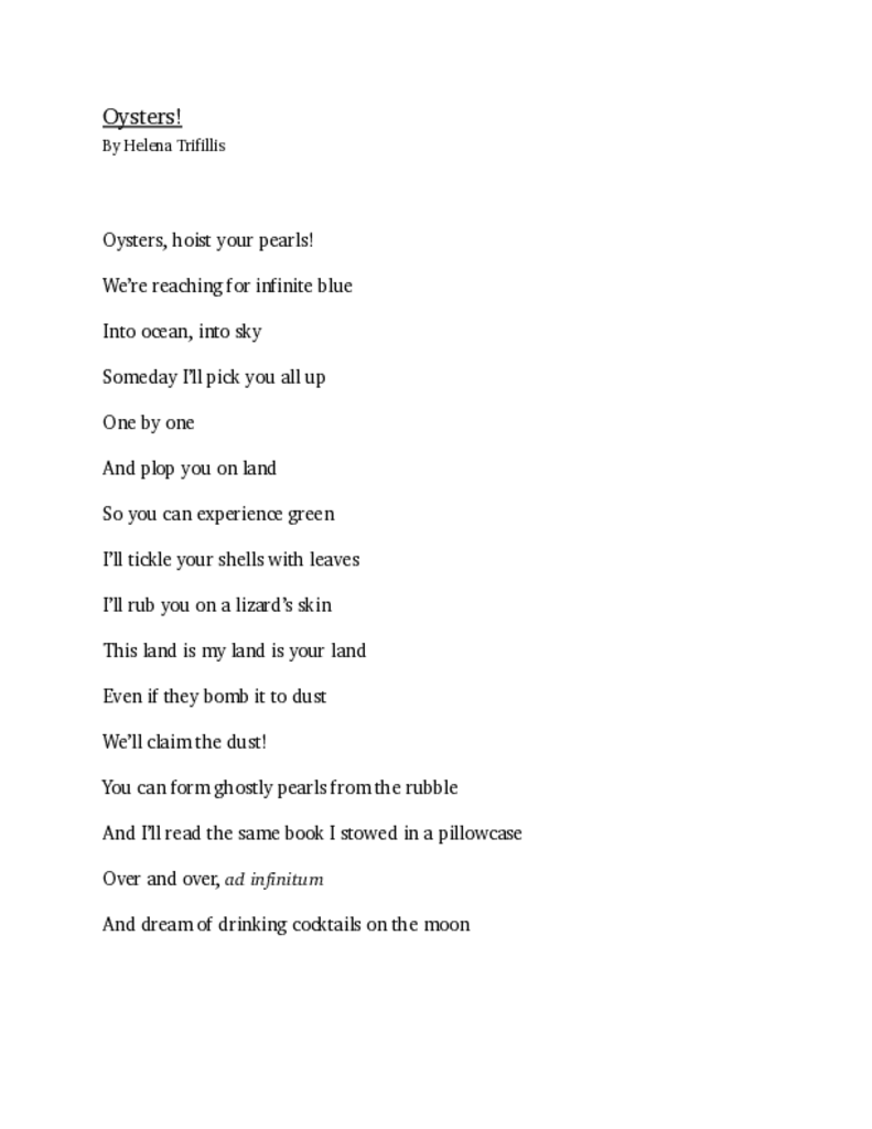 I wrote this poem for the Manor Mill Fairy Trail. I was traveling Australia at the time when my dad emailed me saying he wanted to collaborate with me on an installation for the Fairy Trail. I would provide a poem and he would create a sculpture that reflected the poem. I believe he ended up making a jelly-fish looking creation. The installation can be found along the trail.