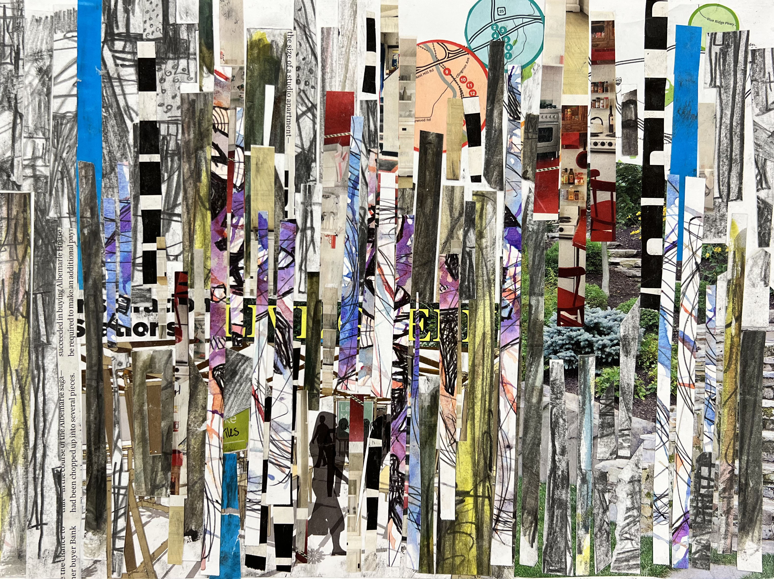 Dispersed Together is a series of abstract mixed-media works created in response to the COVID-19 pandemic. These paintings explore this global crisis in various ways—how individuals were separated in their own communities, police brutality in America, wide spread grief and loss, and more.