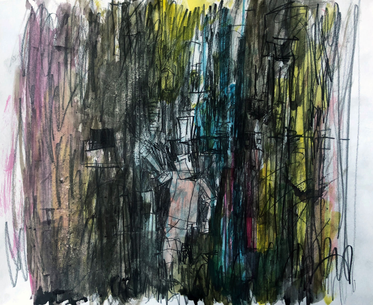 Through layers of paint, graphite, and collaged drawings, each work captures the disorientation and the profound emotional impact of that period. Fragmented structures dissolve into gestures, emotional atmospheres, unfinished and distorted human figures, and traces of inner feelings—evoking the blurred boundaries between safety and exposure, the private and the public, and the body and its environment.