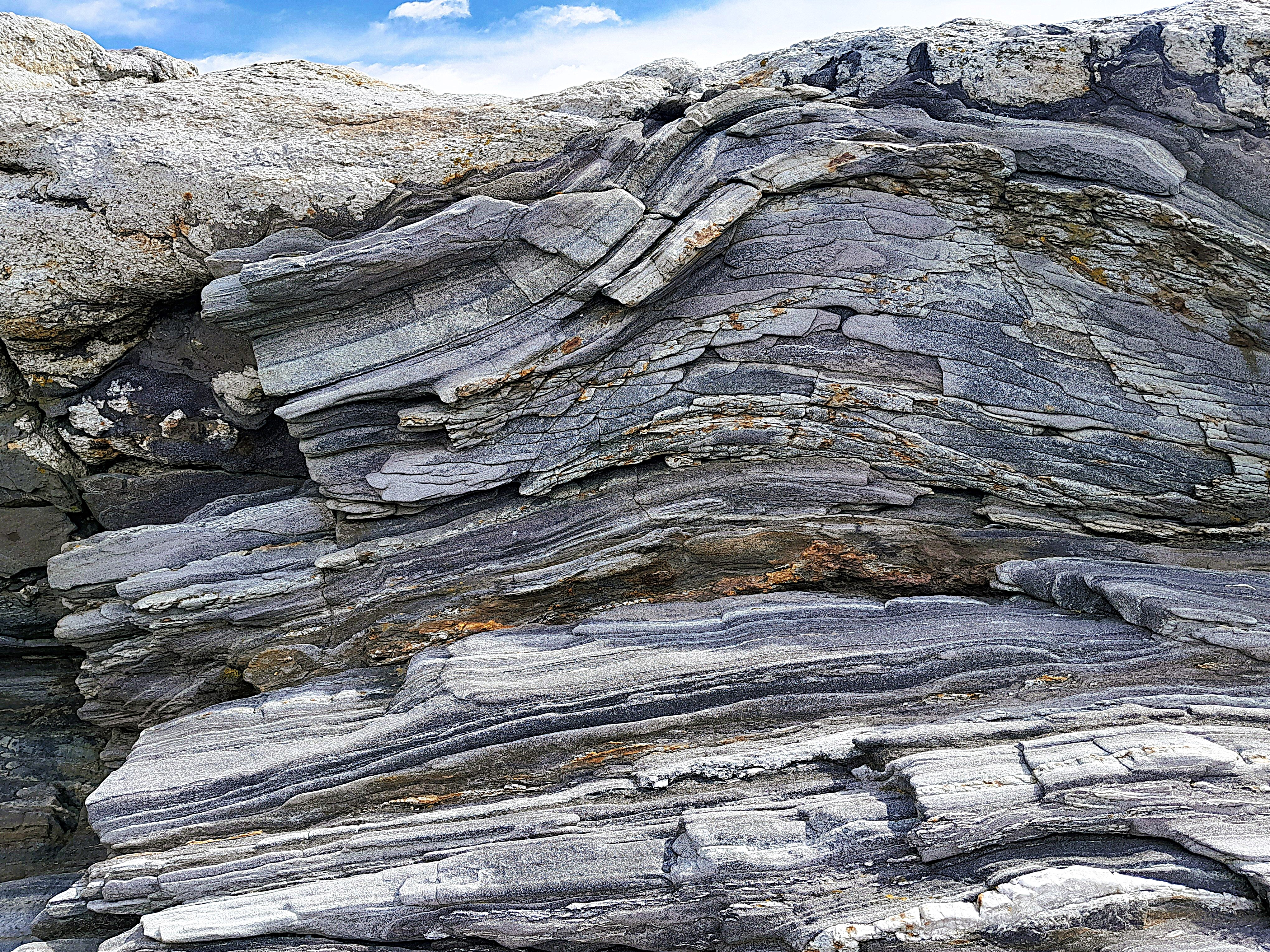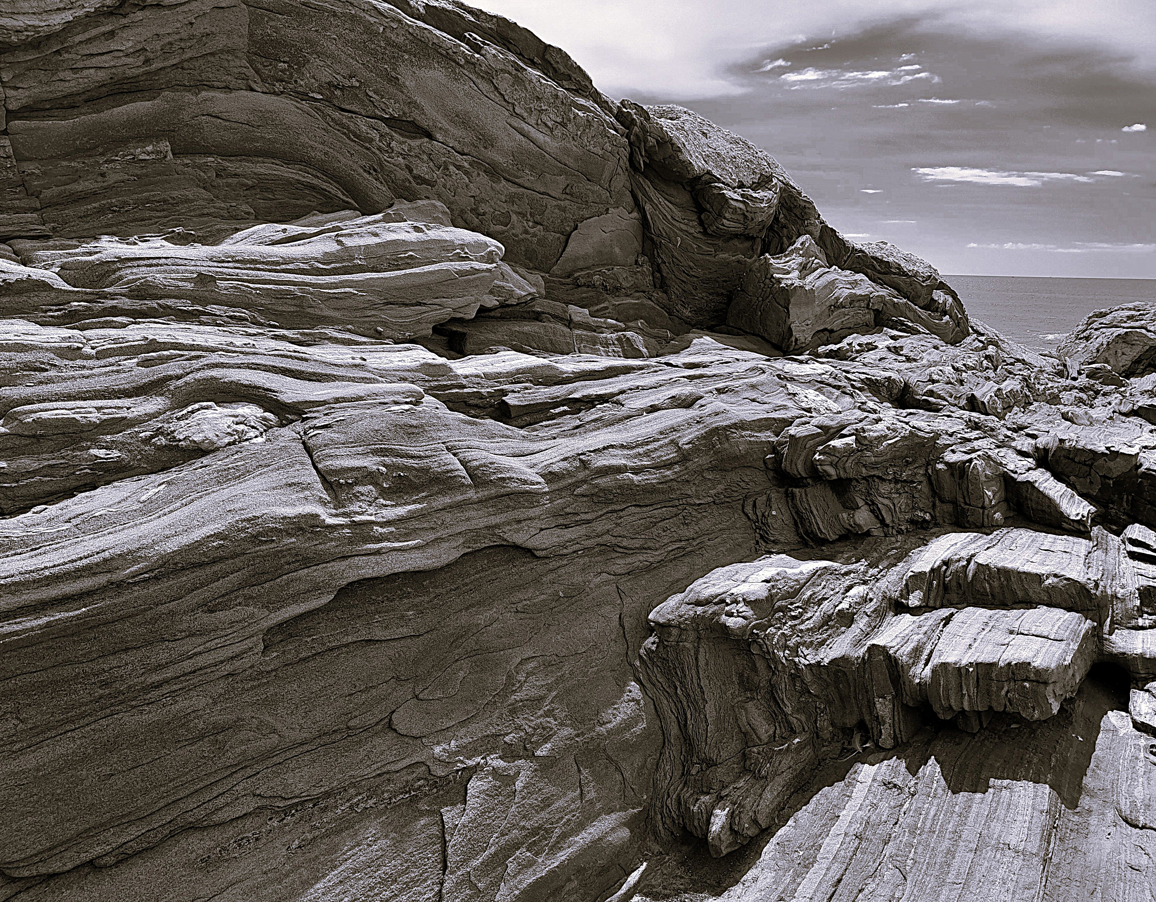 My personal interest in visiting Pemaquid Point has always centered around its remarkable geological formations. Here, a rocky finger made of exposed metamorphic gray rocks, interspersed with dikes of harder, white igneous rock, extends nearly 300 feet out into the ocean. The area’s unique layered rock formations are the result of millions of years of buildup and volcanic molten rock activity, creating a visually striking landscape that is especially appealing to photographers.