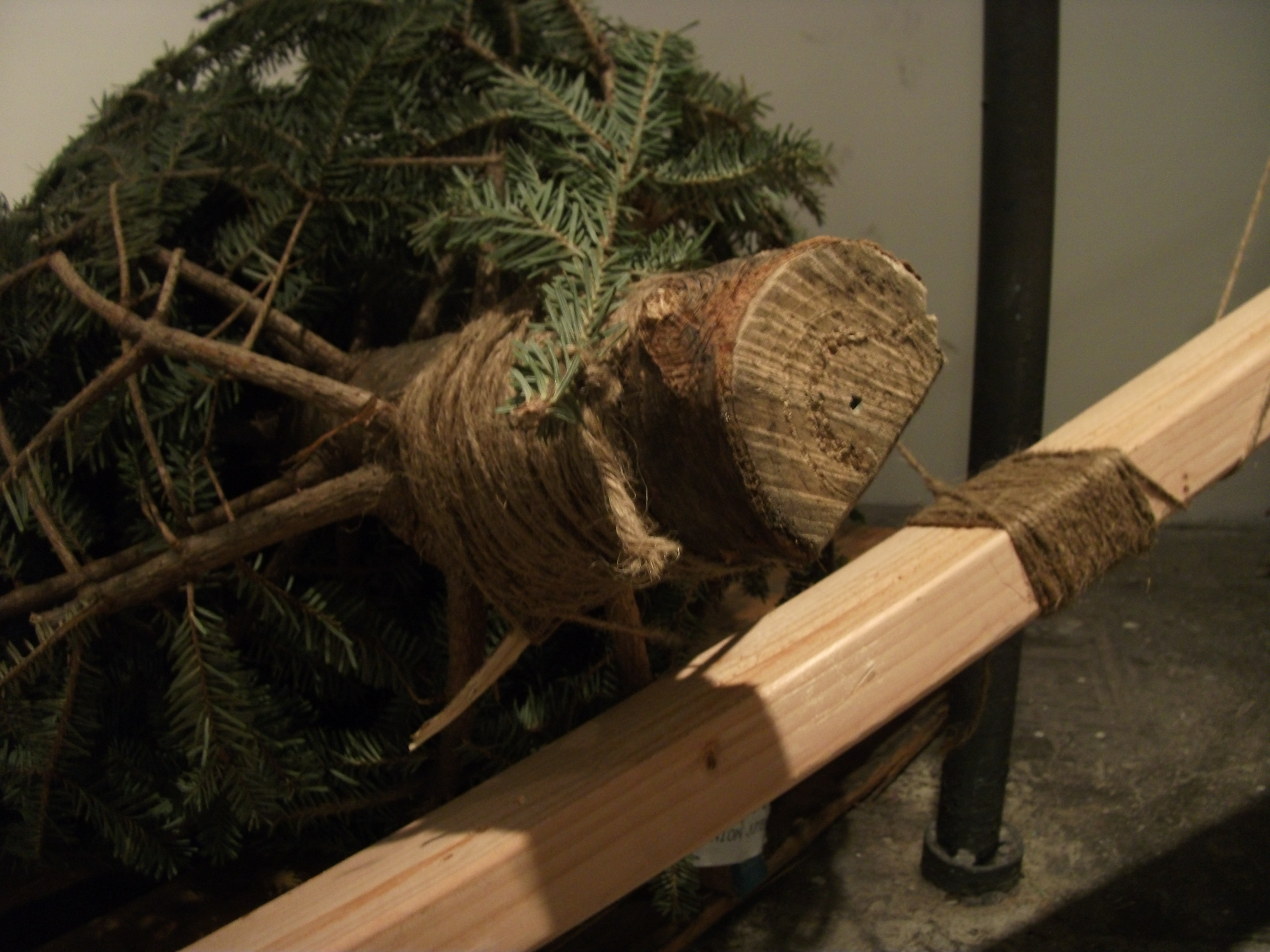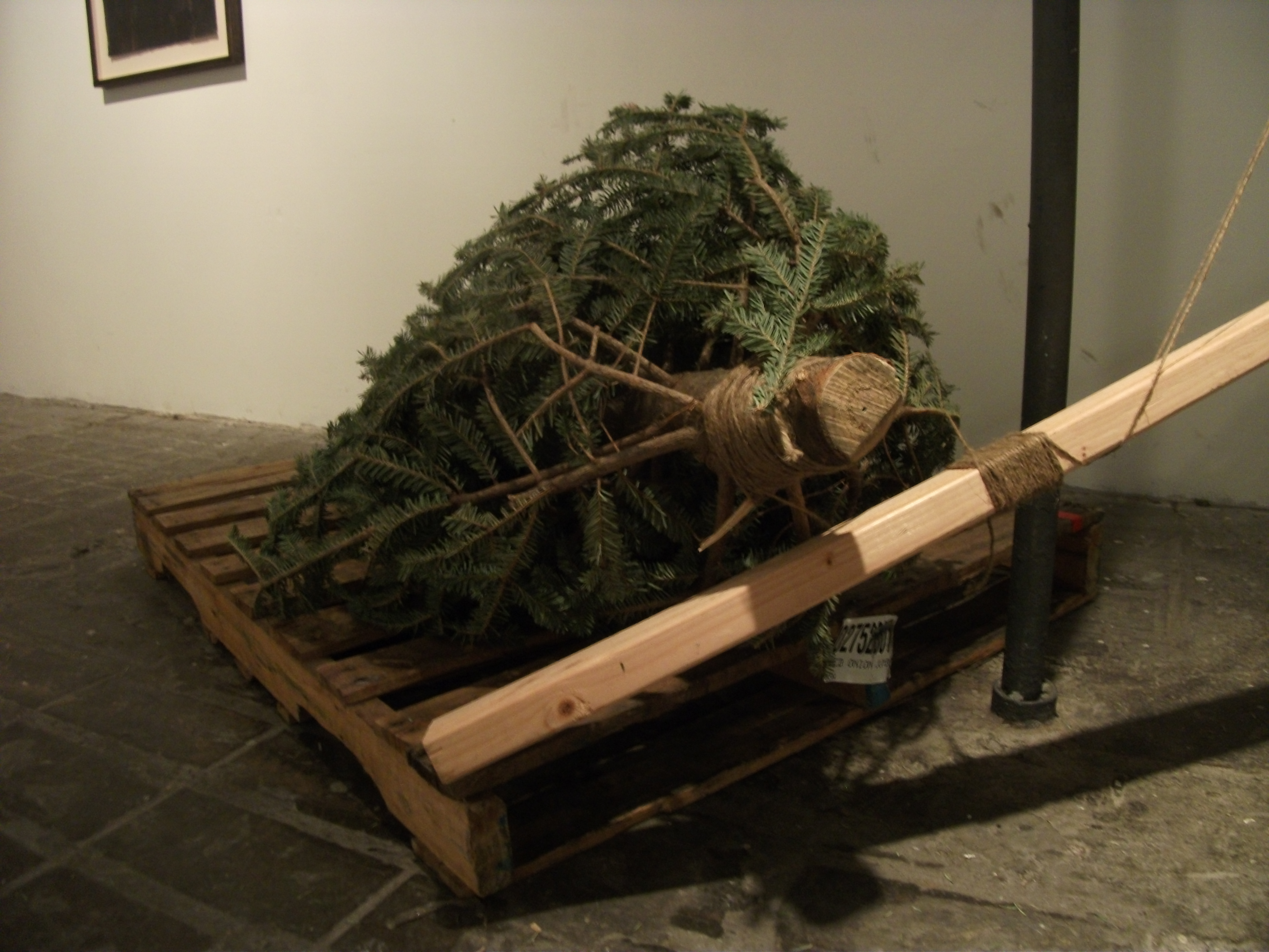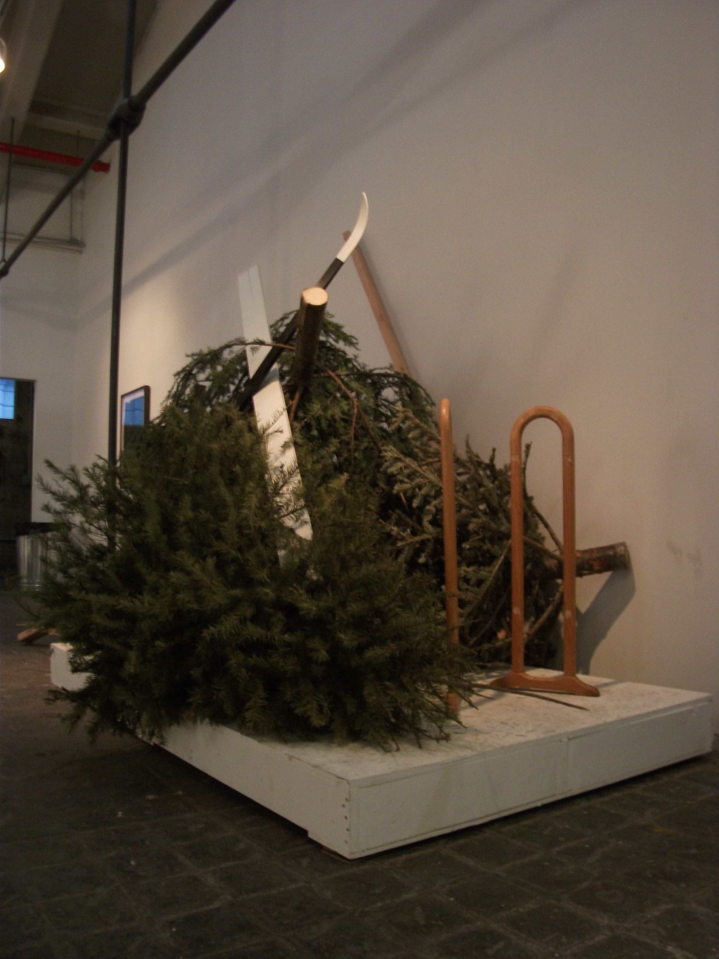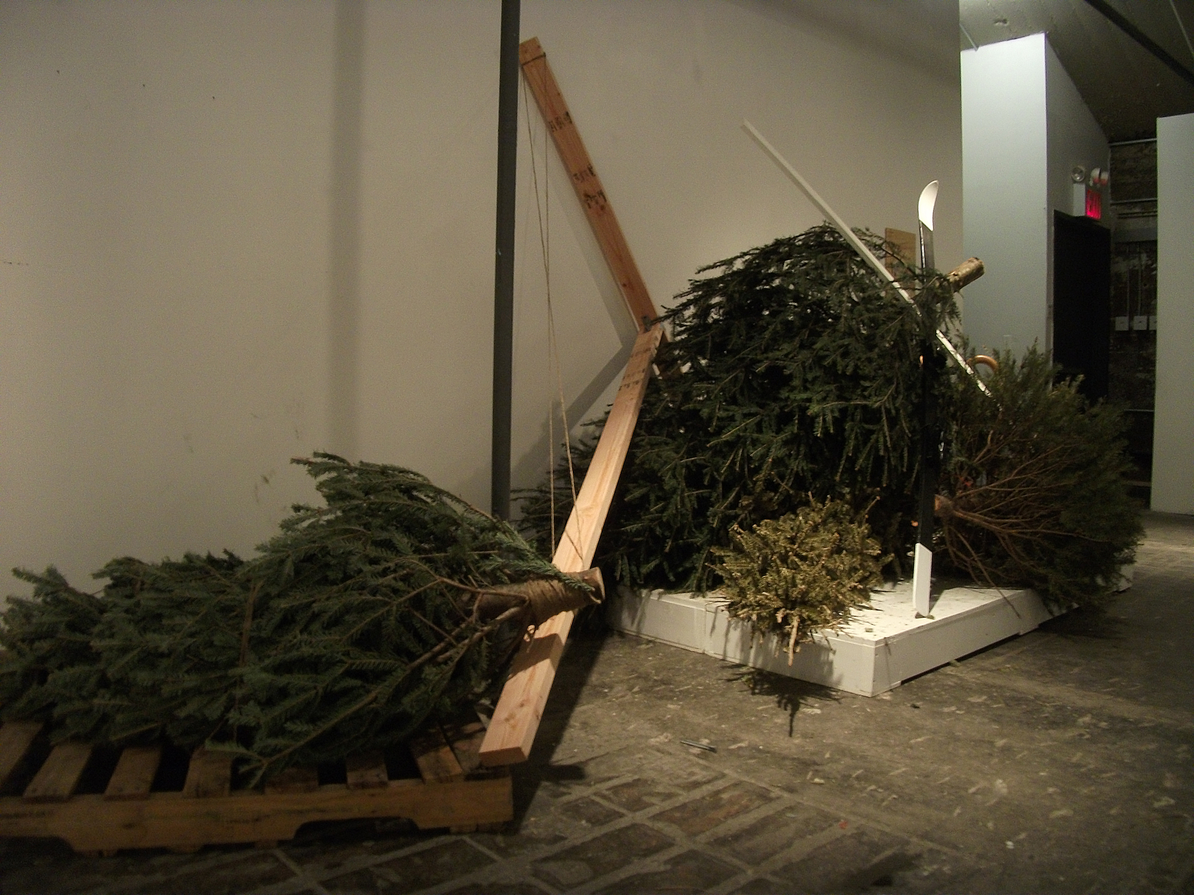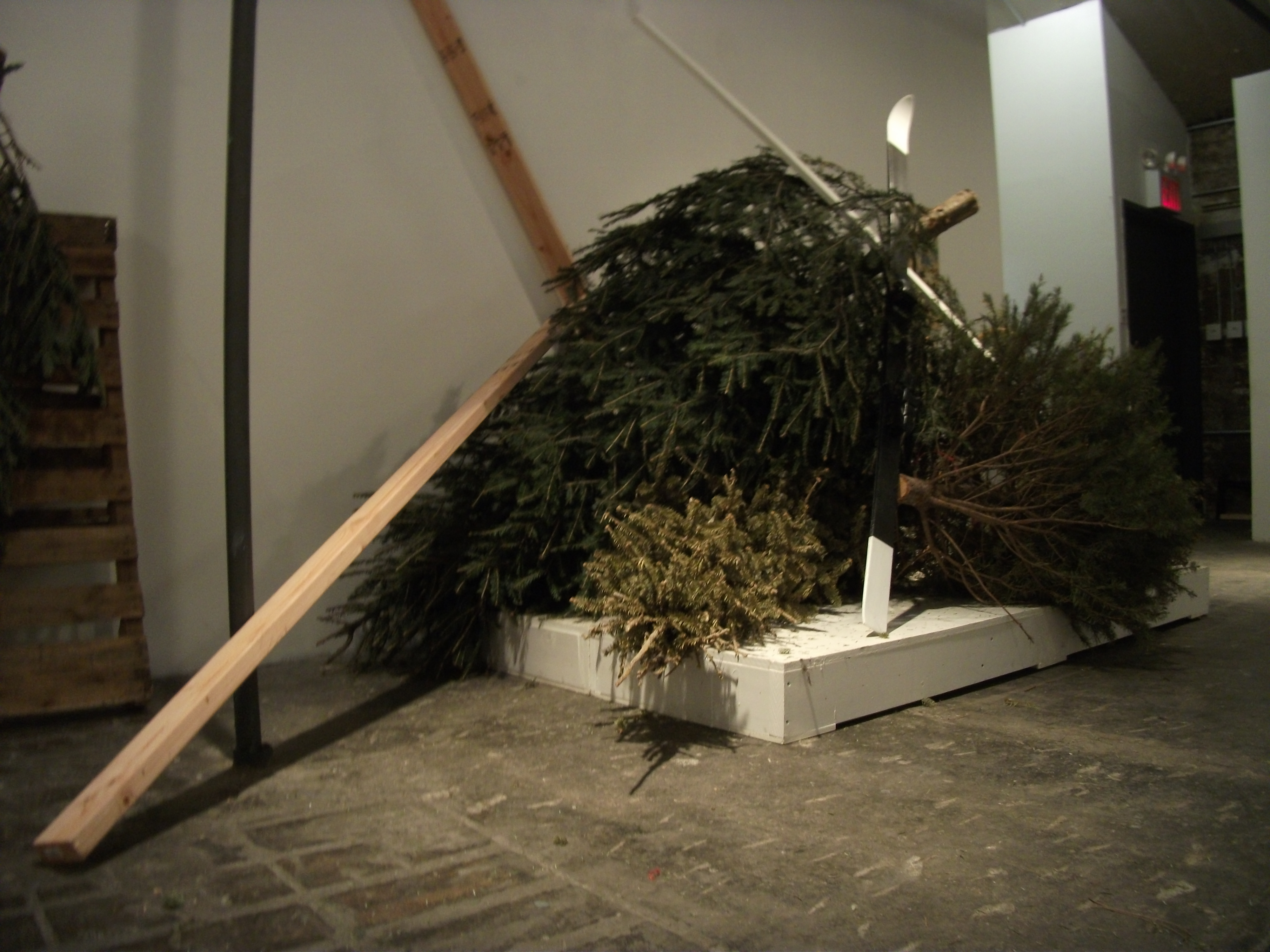 Red Onion JumboInstallation view @ TRD in Brooklyn. Pine trees, wood, snow ski 2014