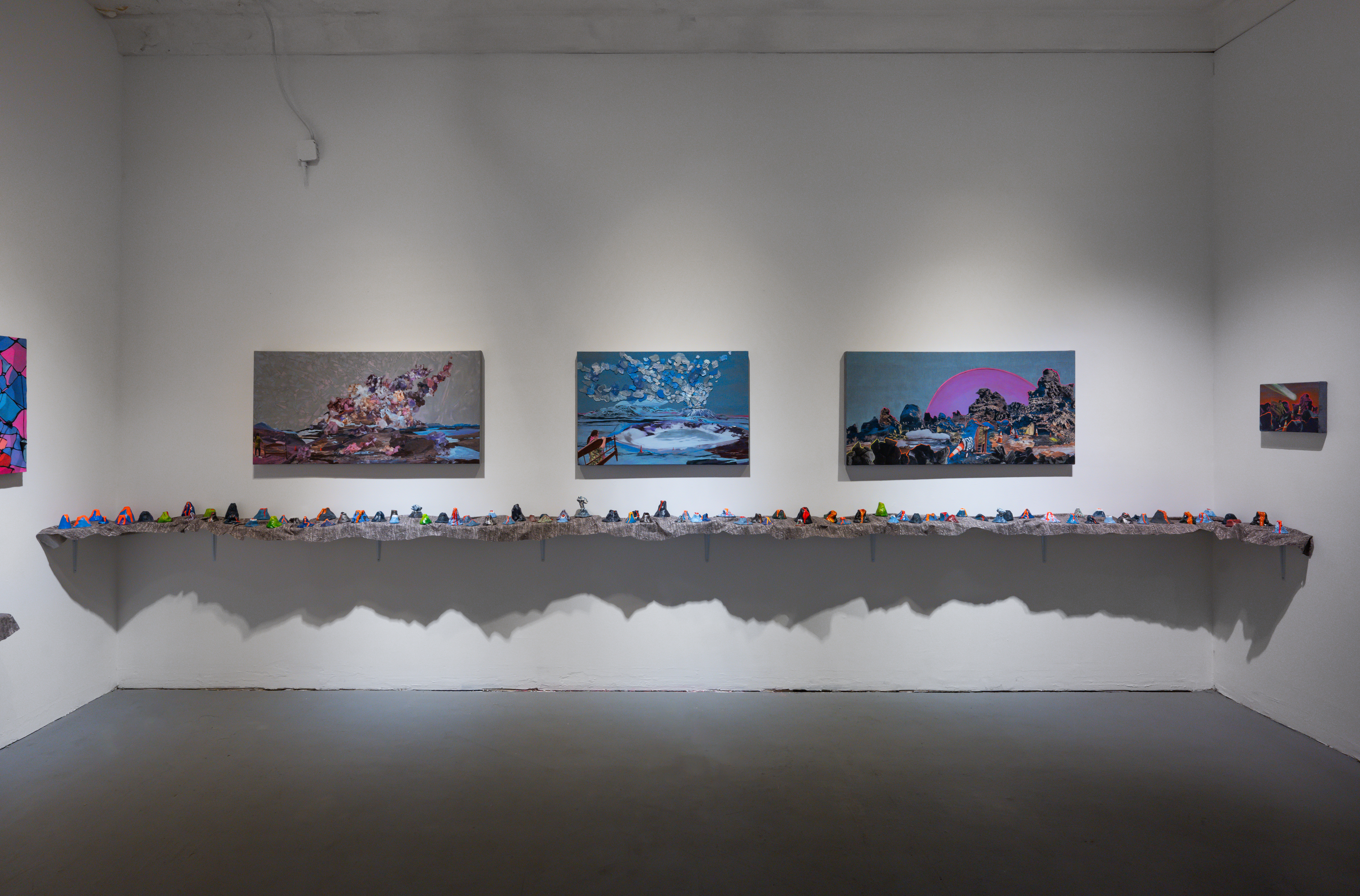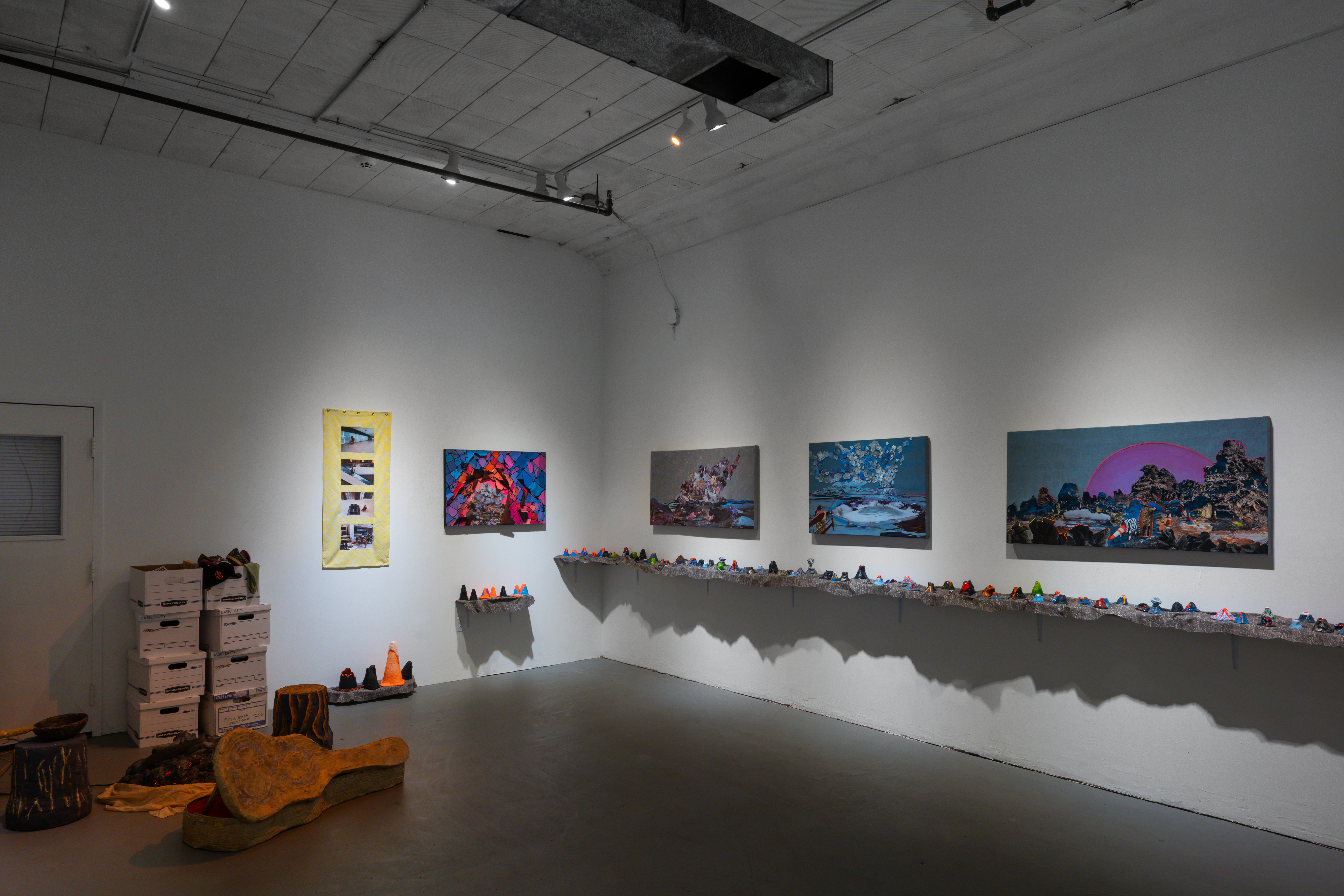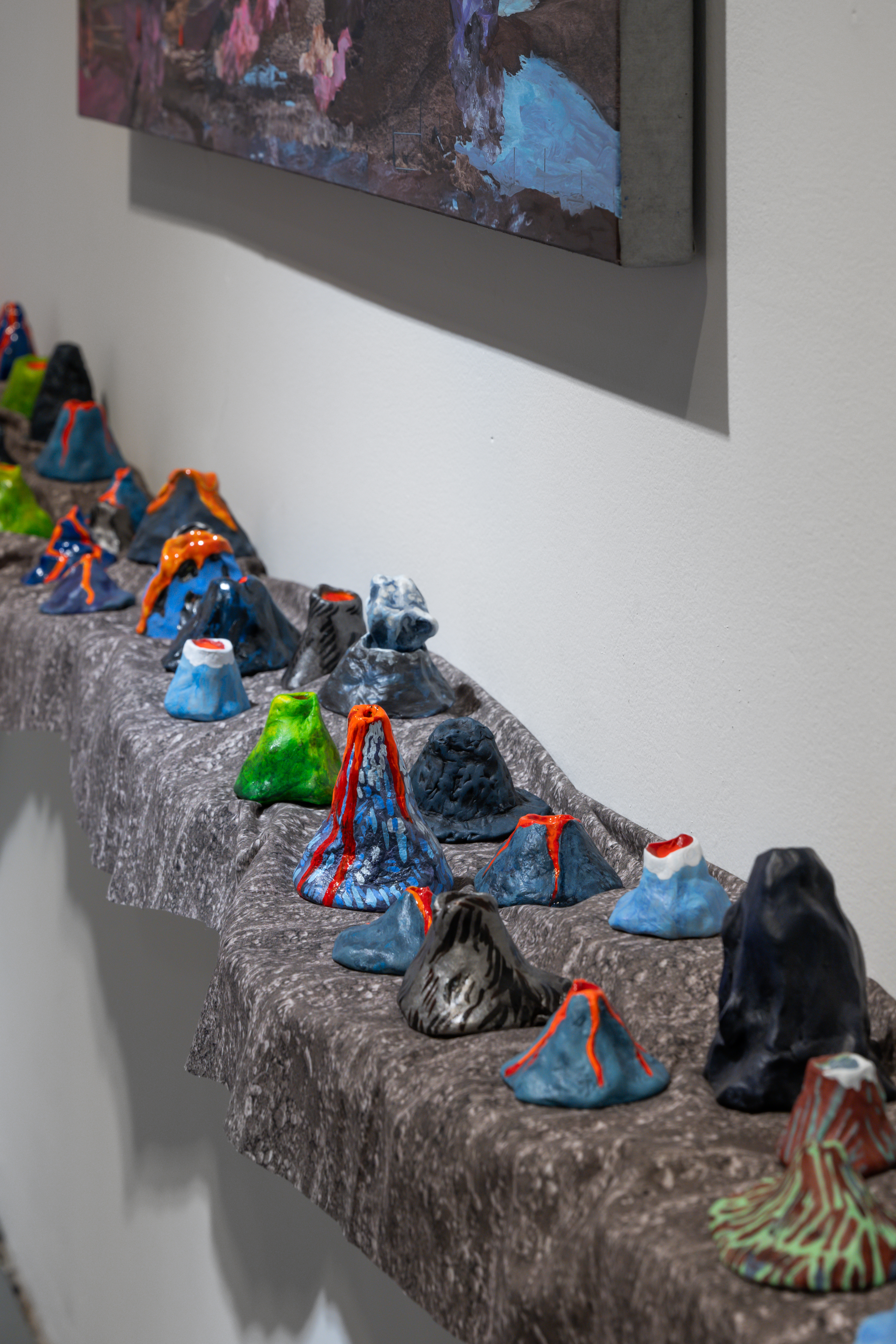 Installation photo by Vivian Marie DoeringInstallation photo by Vivian Marie Doering of Erin Stellmon's sculptures of safety cones and volcanoes on fabric-draped shelves underneath mixed media paintings