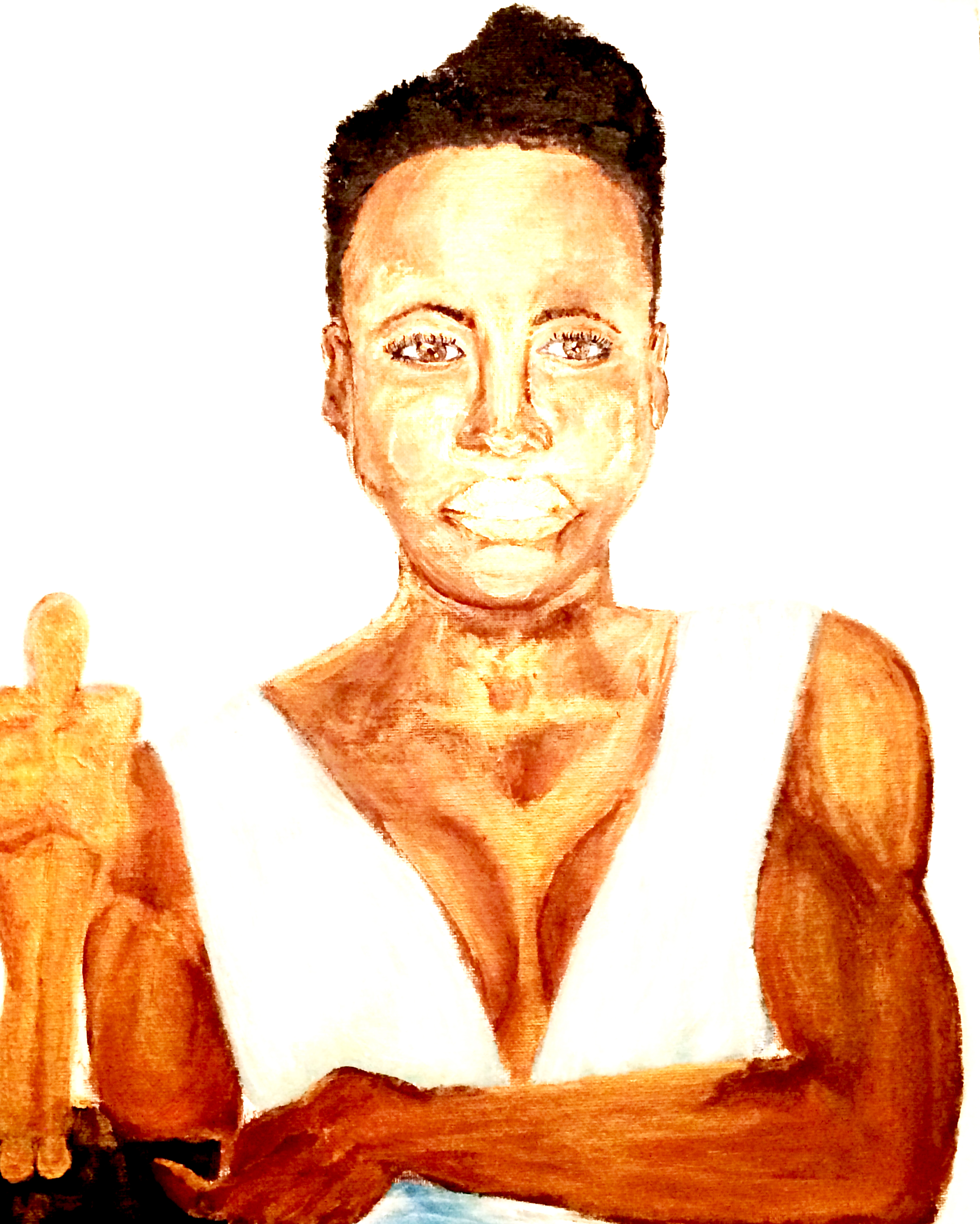 Lupita GoldPainted with Gold and Copper Metallic Acrylic Paint this painting was made to commemorate Lupita's Contribution to the American Film Industry. Her physical strength is accentuated in this painting to symbolize her dedication to honing her skills and craft as an actor.