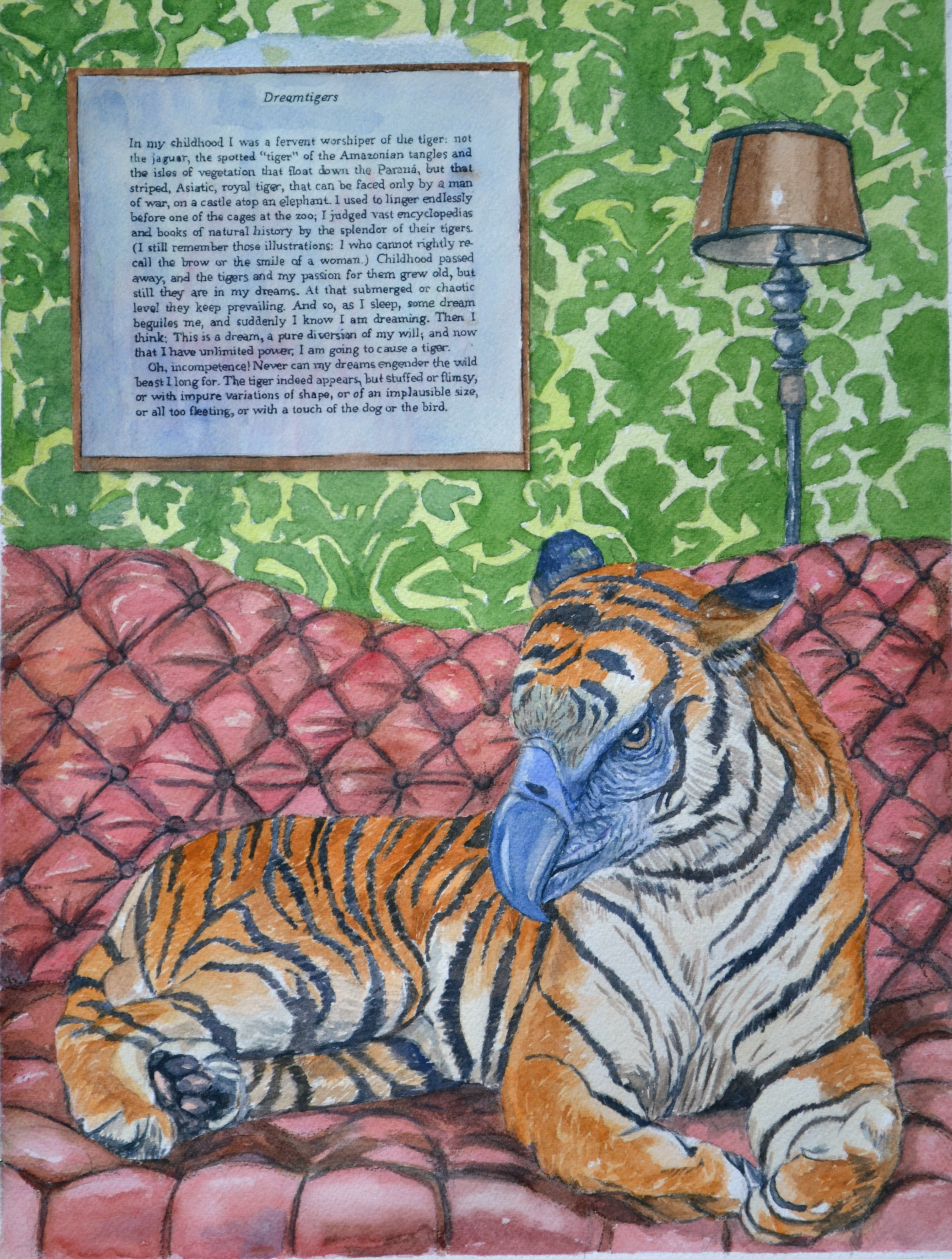 I am at the beginning of this project. It will ultimately culminate in an artist book. I intend to illustrate ideas and stories from Jorges Luis Borges, Franz Kafka, and Edgar Allen Poe. This far I have illustrated several short stories and works of prose by Borges.