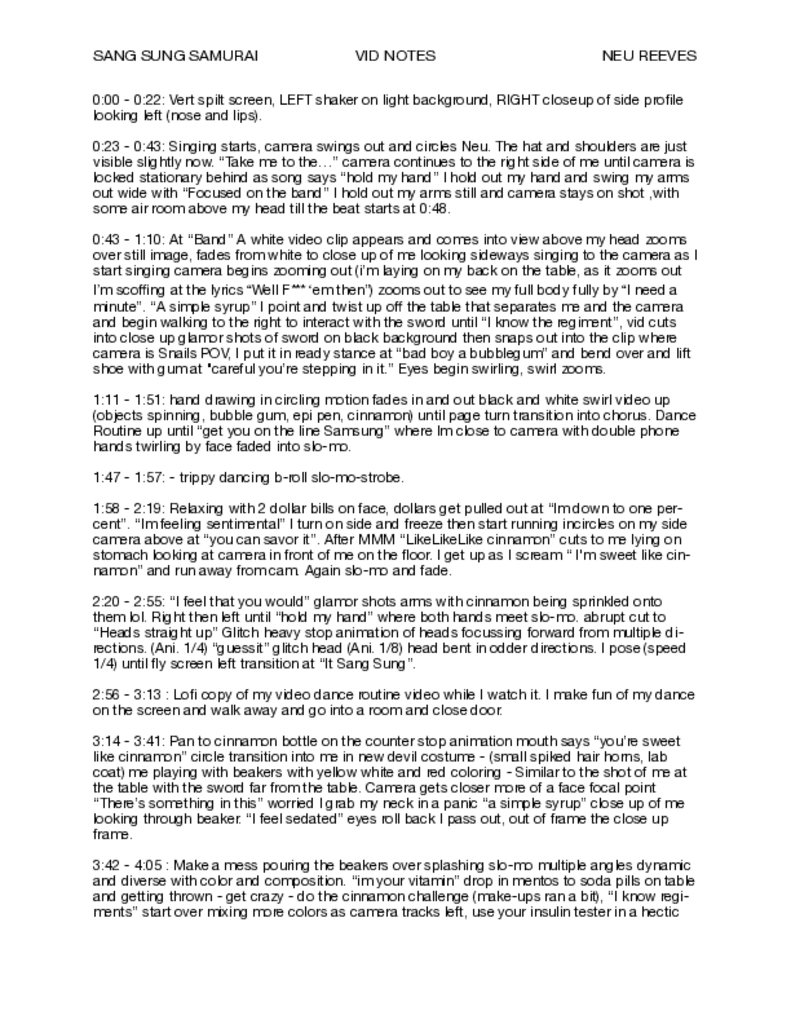 Full of quirks, crescendos, twists, turns, makeup and costumes. Drawing in inspiration from Neu Wave 80s music video film styles. The story is about a samurai, who’s sweet like cinnamon, that is compelled to save a potential partner and warning them of the bad boy scientist that makes high fructose potions. In the script, timed out to coincide with the songs developing narrative, objects become personified and props blow up in size, swords shine, sentimental silhouettes are drawn across the camera via dance. *See storyboard doc. for more insight about the project. For the project I hope to not only have a video produced by talented video artists and animators I know but also to make a short play inspired from this storyboard.