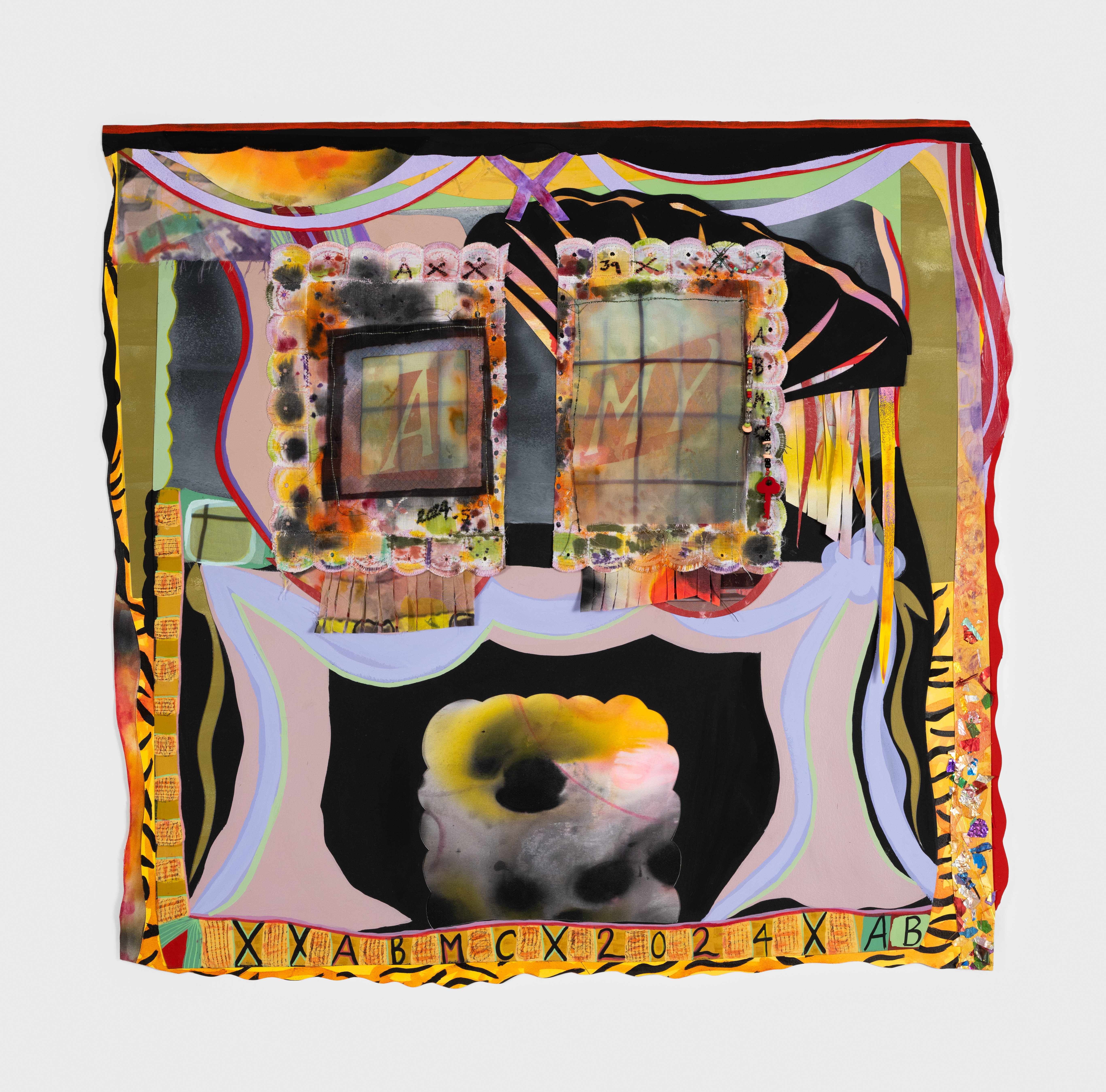 Amy Boone-McCreesh utilizes maximal aesthetics and visual tropes of grandeur in a new series that conflates window views and consumption of luxury goods. Her formative experiences growing up in a low socio-economic setting have led to further examinations of markers of success and how they manifest visually. The commodified access to beauty and nature mix with a knee-jerk opposition to notions of “good” taste in her colorful mixed-media spaces. Hand-cut collaged works on paper are informed by the labor of craft and domesticity. This is countered by the precise geometry of interior spaces and the machine-cut, synthetic materials present in the curtain-like window hangings and wall charms. Borrowing from the world she inhabits, Boone-McCreesh aspires to visually delight while questioning the prominent tastes of cultural acceptance.