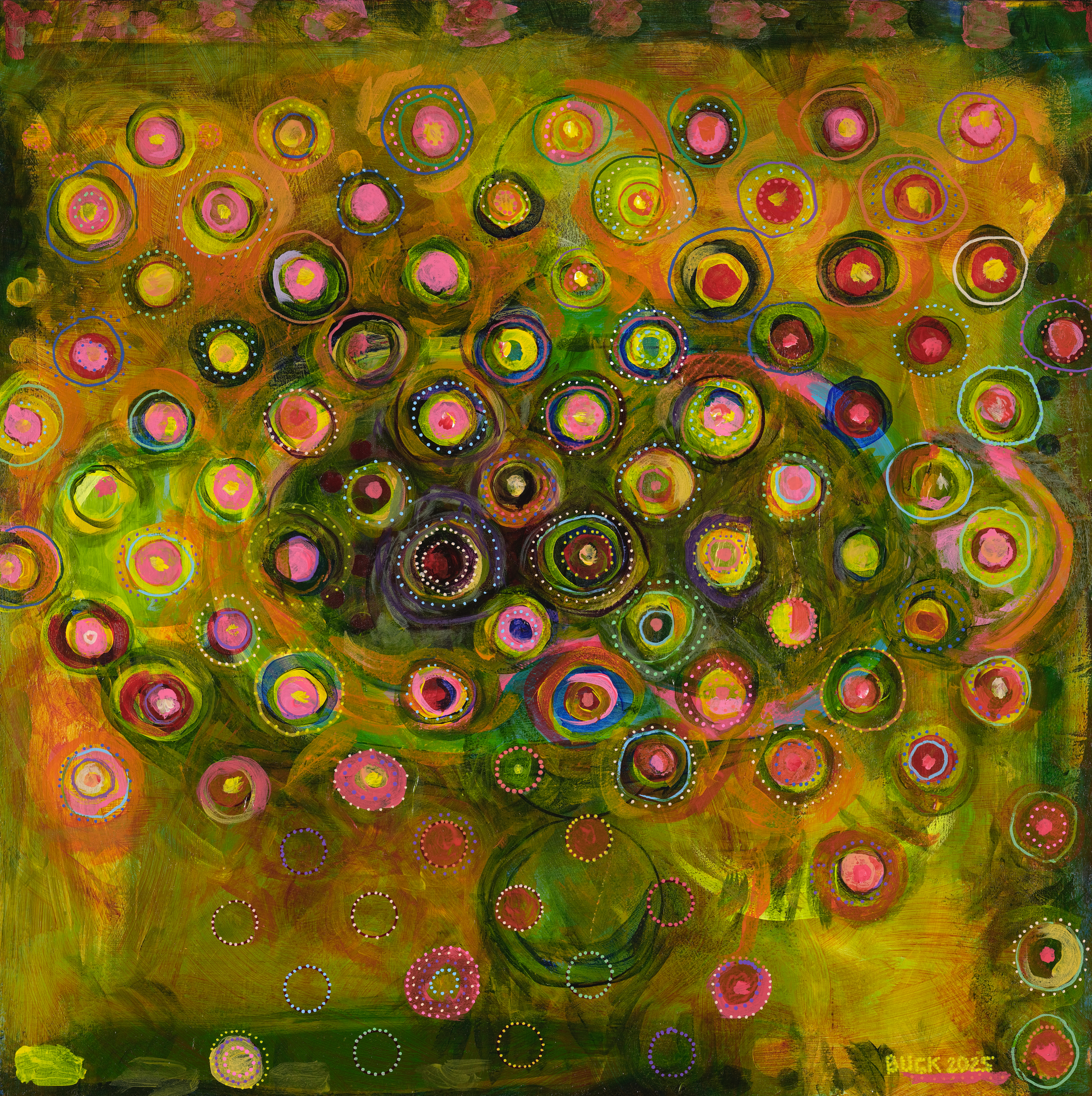 Bulls-eye, 2025.For me, this work symbolizes the constant pulse of information human beings are exposed to. The reach and impact of electronic data is advancing beyond the scope of understanding. The use of electronics and our immersion in a sea of its energetic, magnetic vibrations are infinite. This painting represents that pulse to which we are all continually exposed. Circles range in size, placement, and color, creating an optical reverberation across the surface, generating an optical energy. These could be living cells, molecular vibrations, or electrical pulses. There is repetition, and a vibration to each form and each retains its distinct qualities.