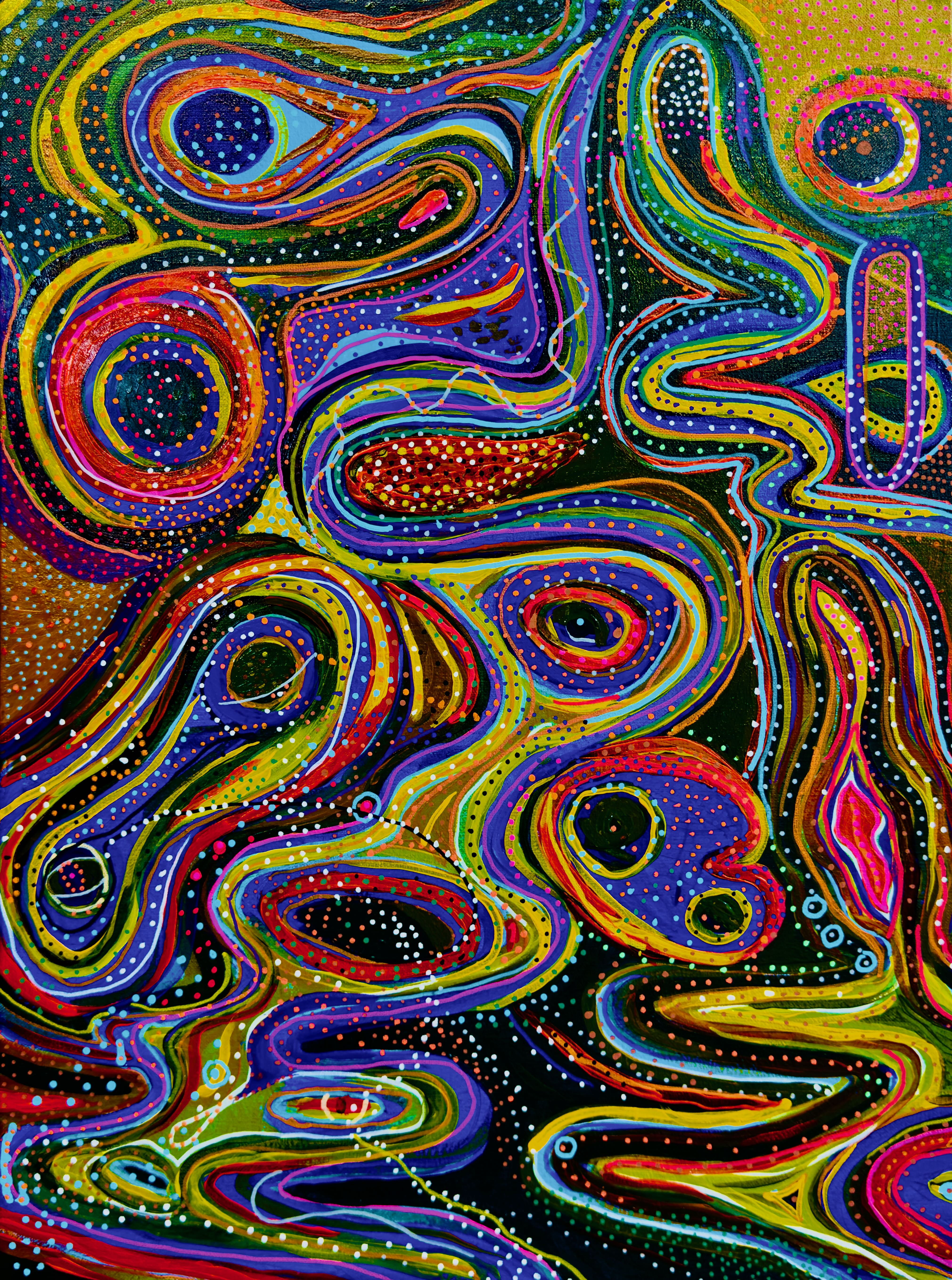 Watching, 2025This vivid, energetic work presents undulating, organic forms outlined in layers of electric: neon yellow, magenta, blue, orange, and purple, layered and bordered in contrasting hues. Evoking motion—the concentric ovals, loops, and biomorphic shapes pulse across the canvas. Small dots scattered over the painting, add texture and rhythm— and a dark background grounds the intensity of the saturated colors, creating a sense of depth and mystery.