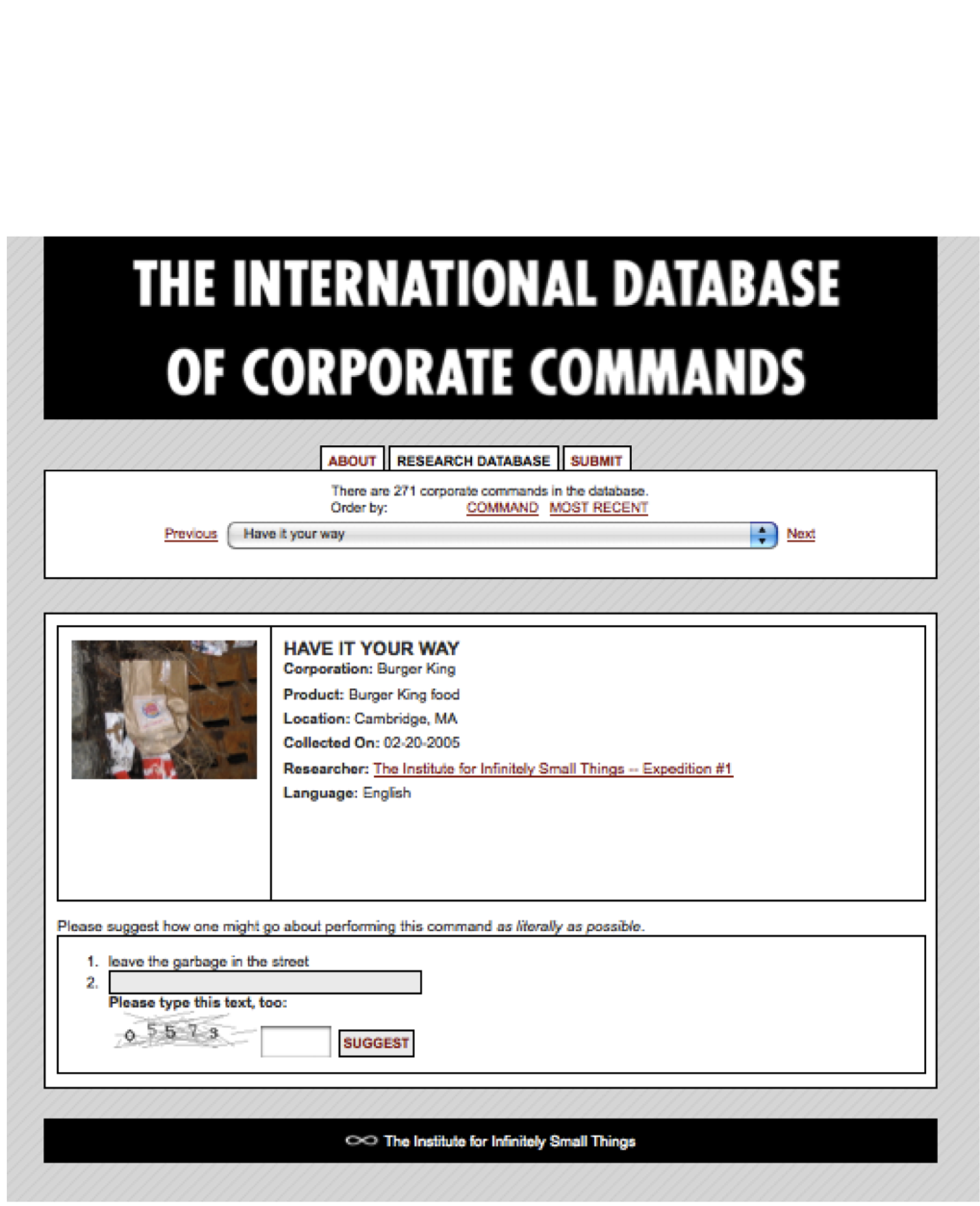 Corporate Commands2004 - present. Performances of corporate commands (ads in the imperative) where they occur in the urban landscape. We try to perform each command as literally as possible. There have been more than 15 performances of corporate commands in the U.S. and Canada in public and private urban spaces. -