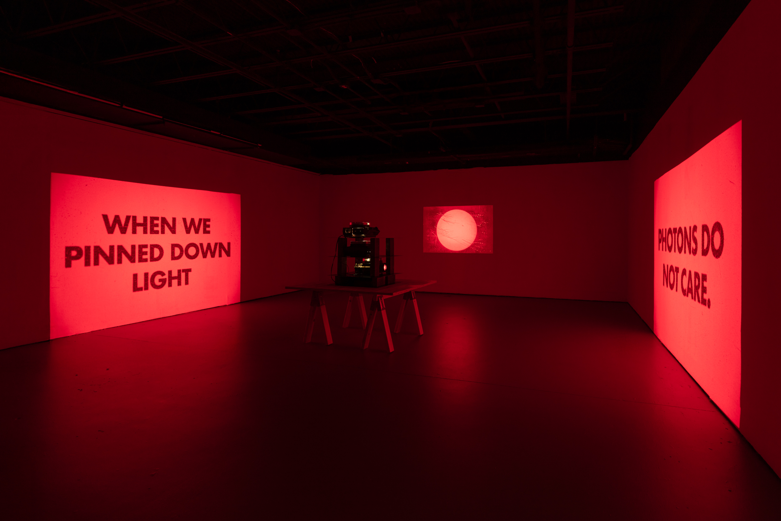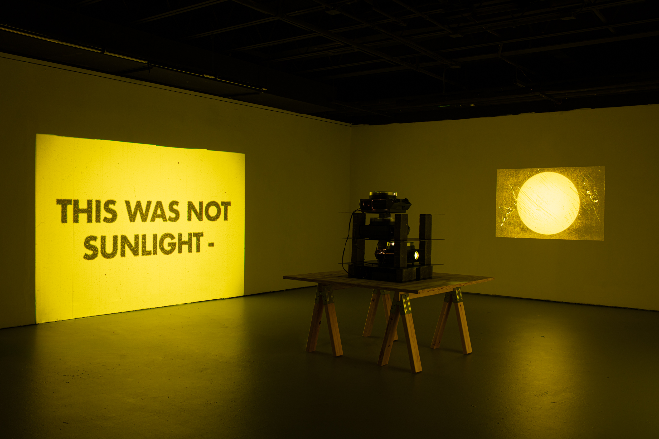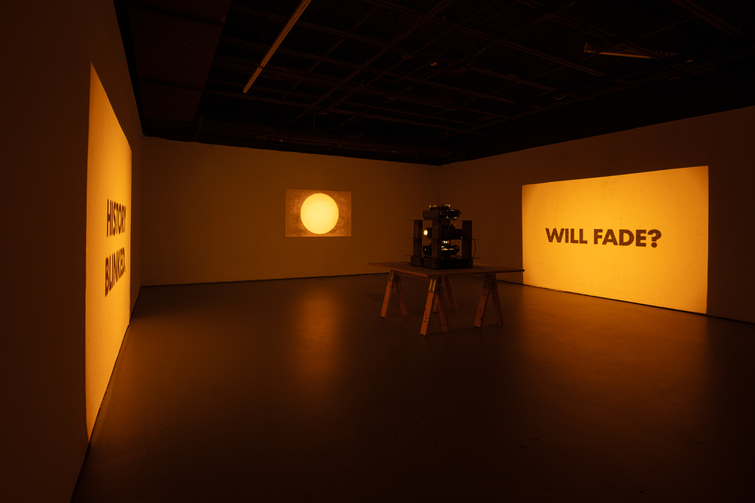 The installation is centered on slide reproductions of the first photographic image ever taken of the sun, flanked on either side by two poems written by me. This work evokes the unique connection between the sun and human-generated nuclear energy. In their reliance on nuclear processes, the sun and nuclear weapons are linked, although their fundamental impacts on humankind are diametrically opposed; the sun’s energy is the foundation of life on Earth, while nuclear weapons embody the possibility of its total destruction.