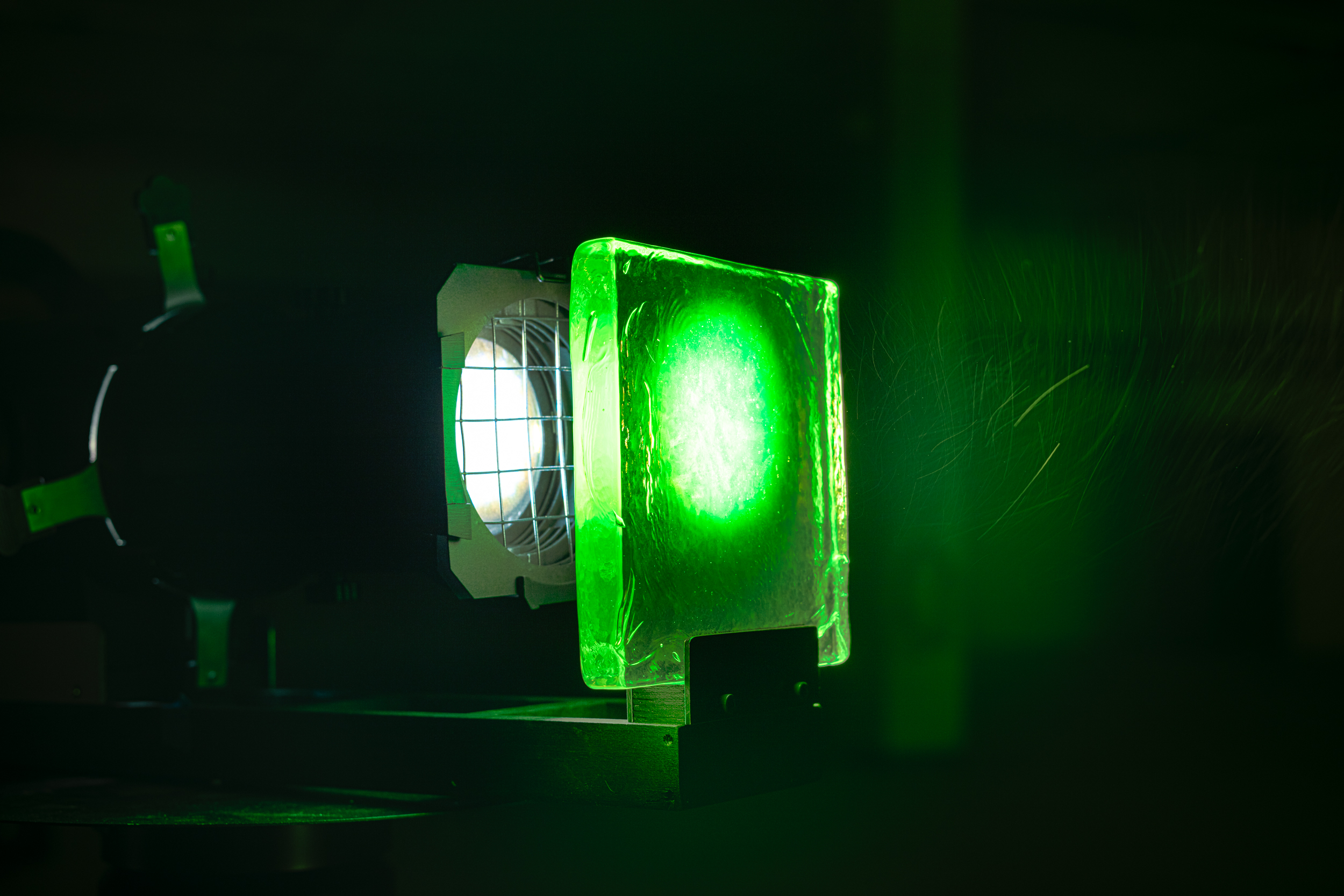 Site-specific installation (Theater light, uranium glass slab, slab holder, motorized base, Found objects)