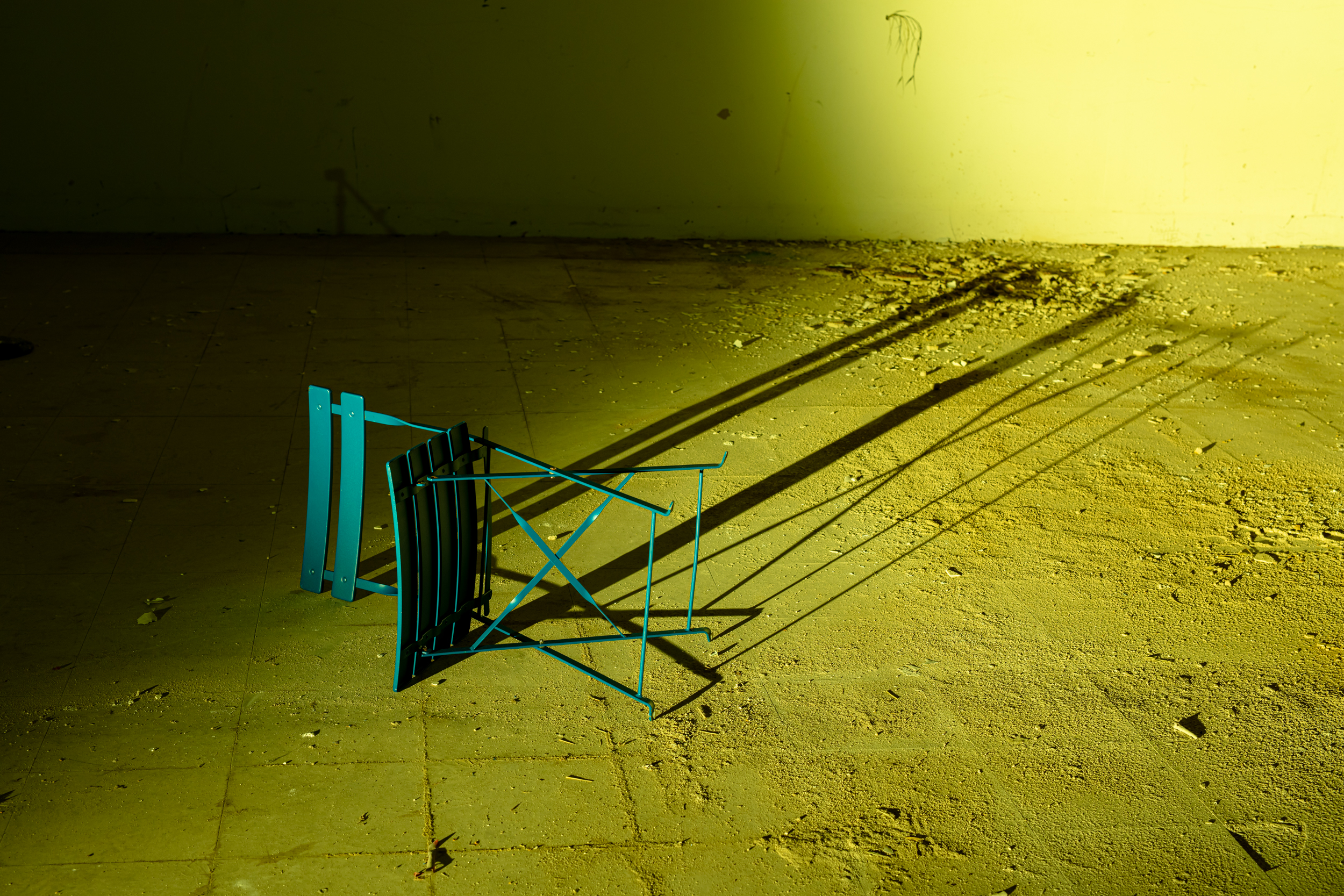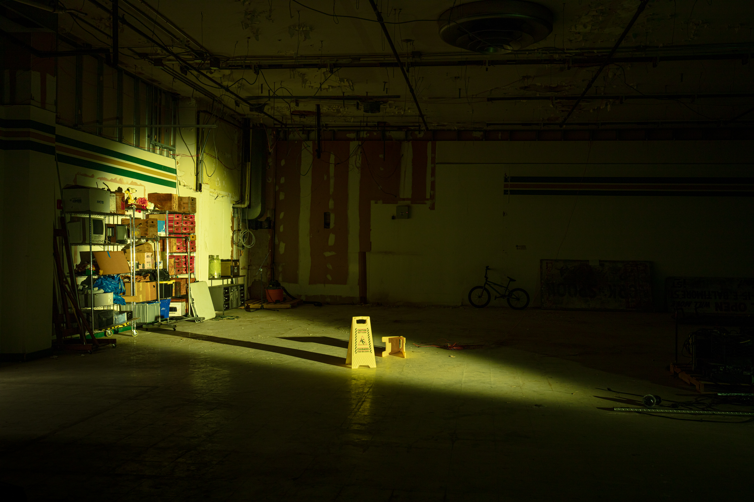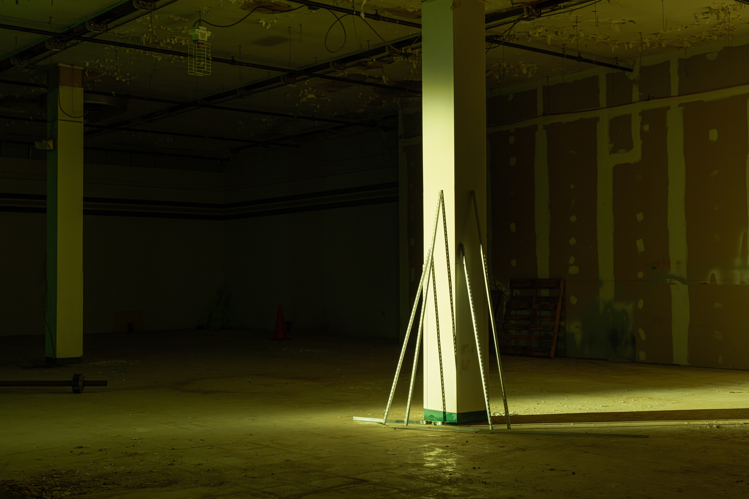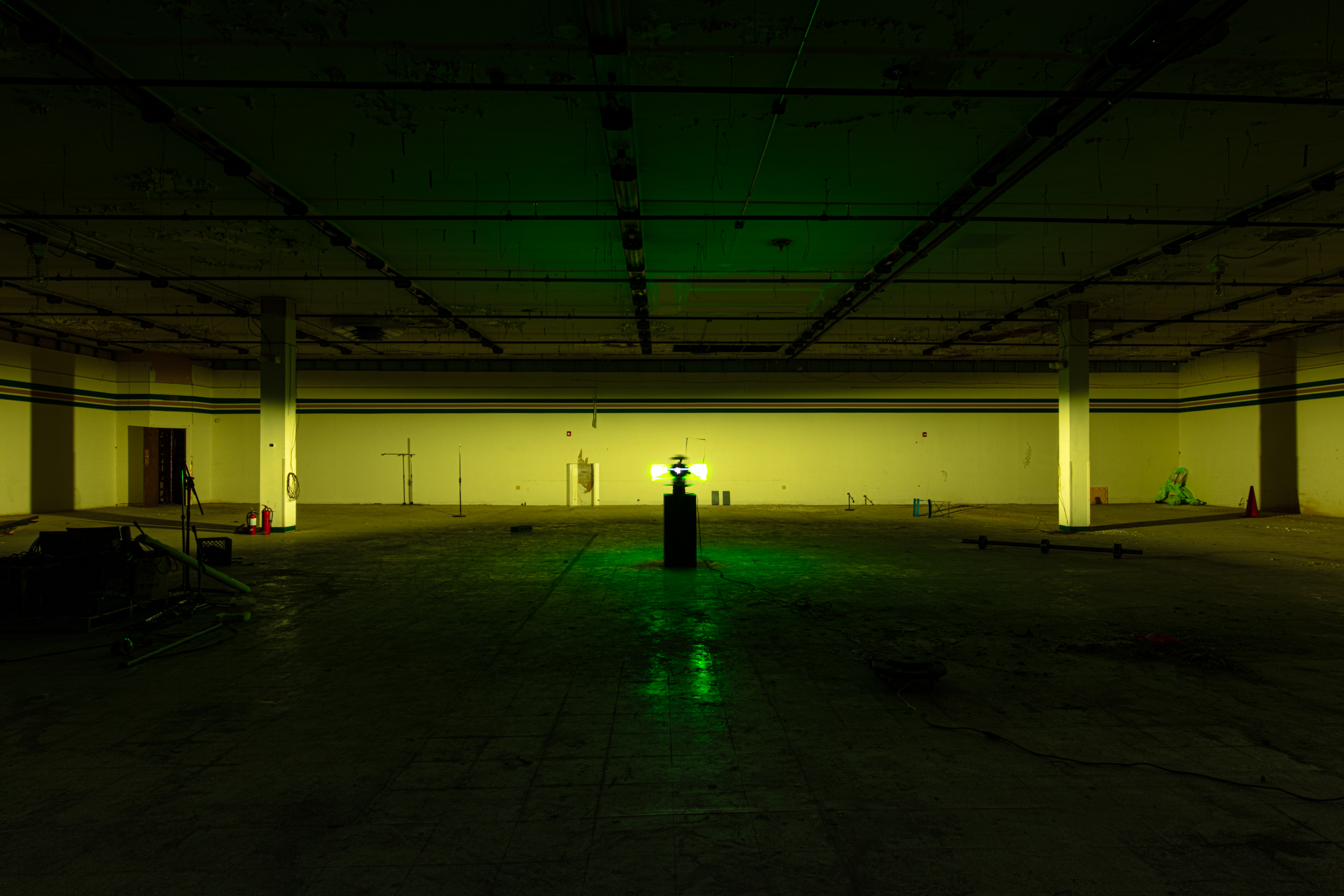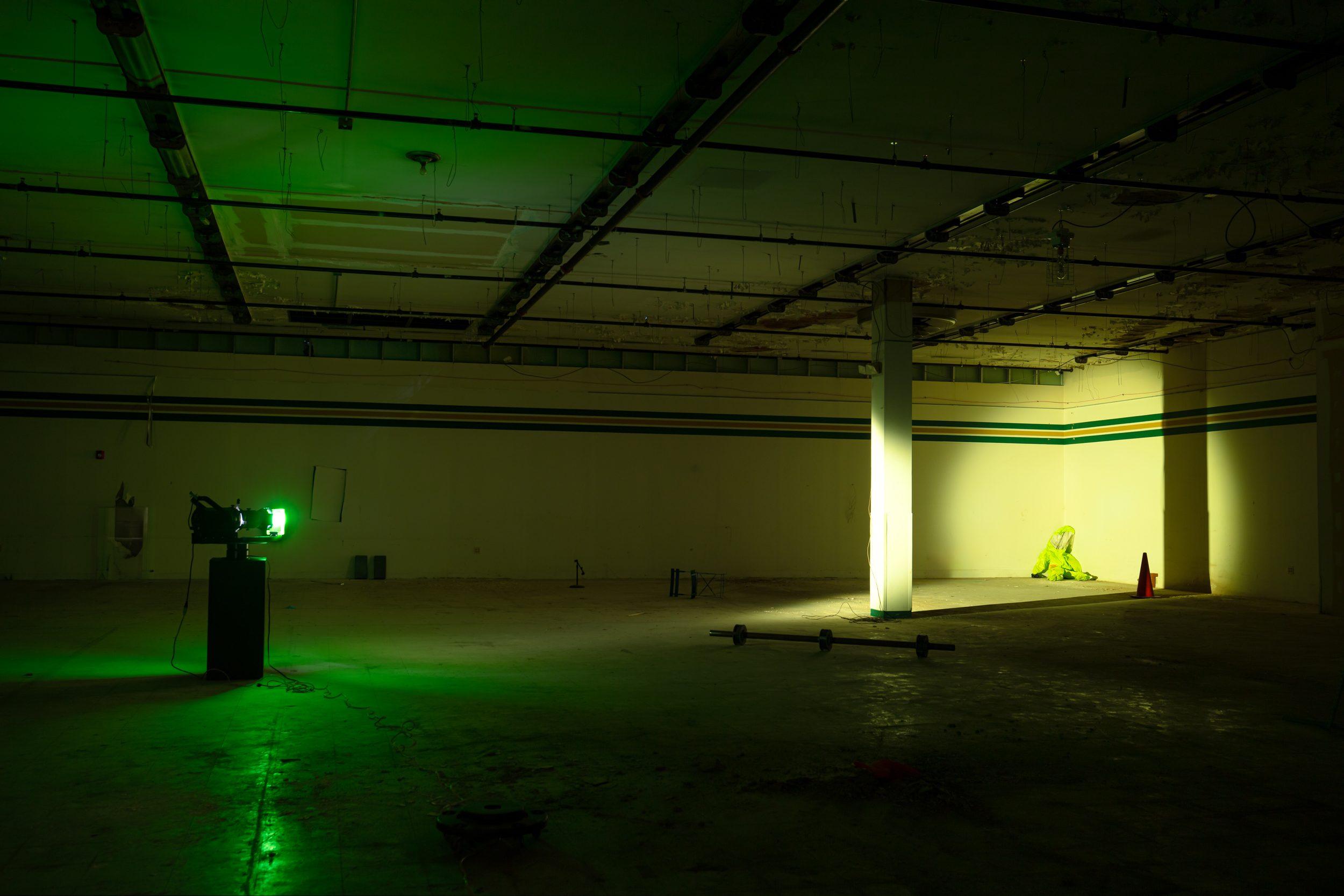 Penumbra’s Skin is a site-specific installation set within an abandoned building in Baltimore. A slow-moving spotlight, mounted at chest height on a motorized pedestal, rotates in a straight path across the large space. Positioned in front of the beam is a thick slab of uranium glass—an early 20th-century material once prized for its luminous green glow. As the beam filters through the glass, it casts a radioactive hue across the room, illuminating fragments of the past: discarded signage, mic stands, umbrellas, a plastic flamingo, and a green hazmat suit slumped in one corner.