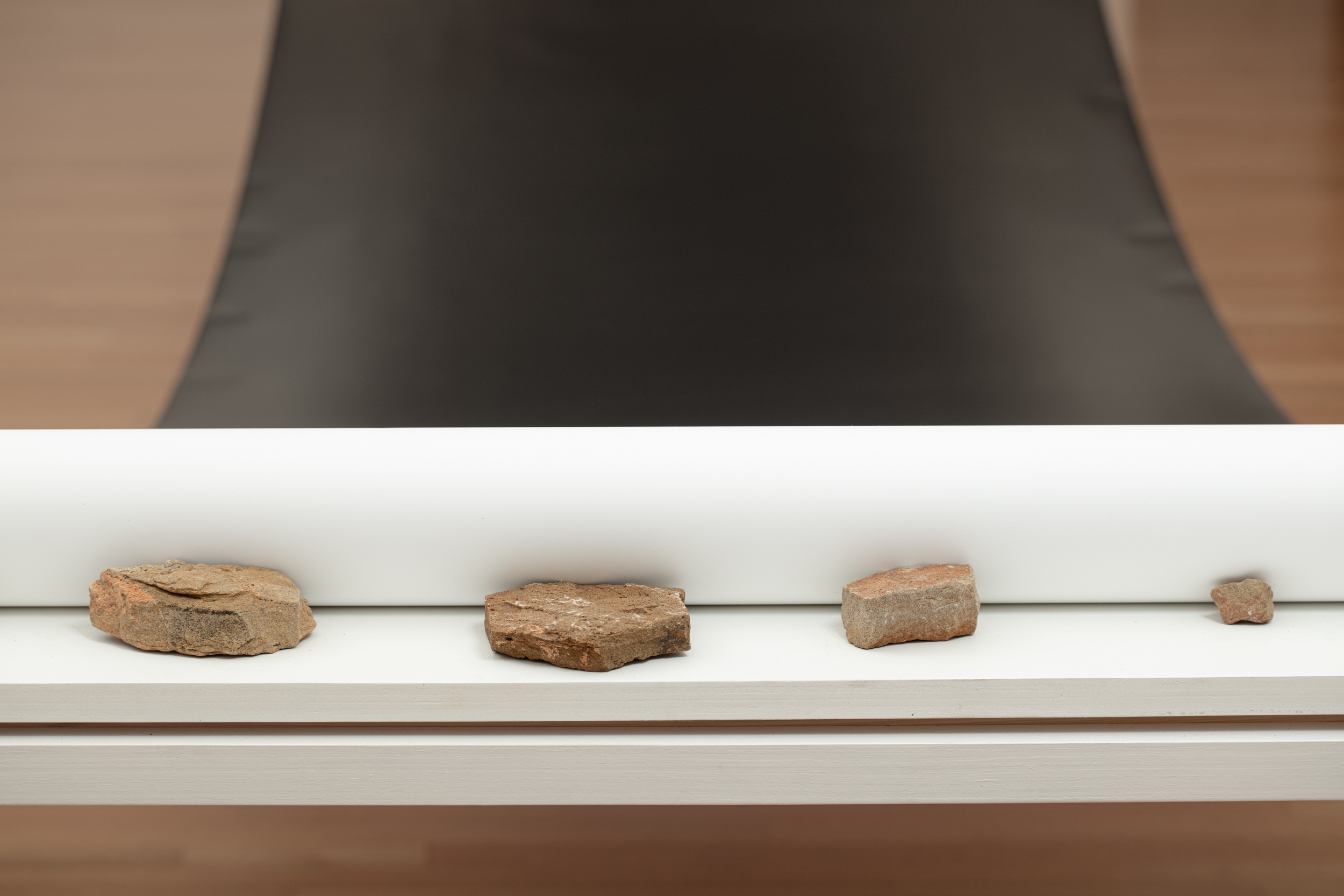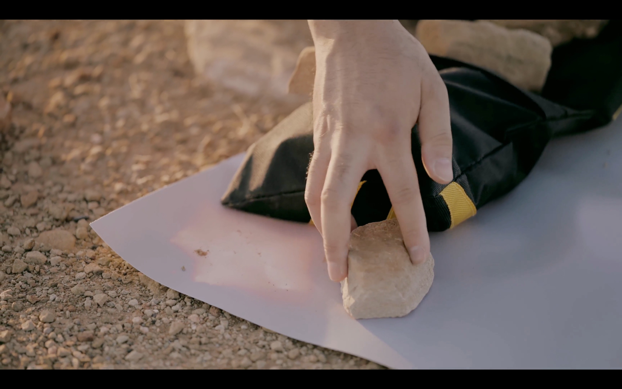 Scroll (light sensitive paper, sunlight), found rocks, video documentation of the performance, wooden platform