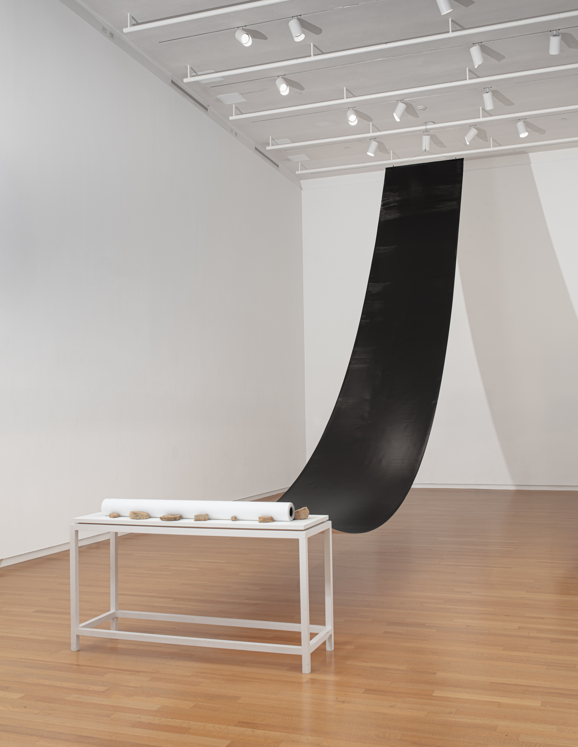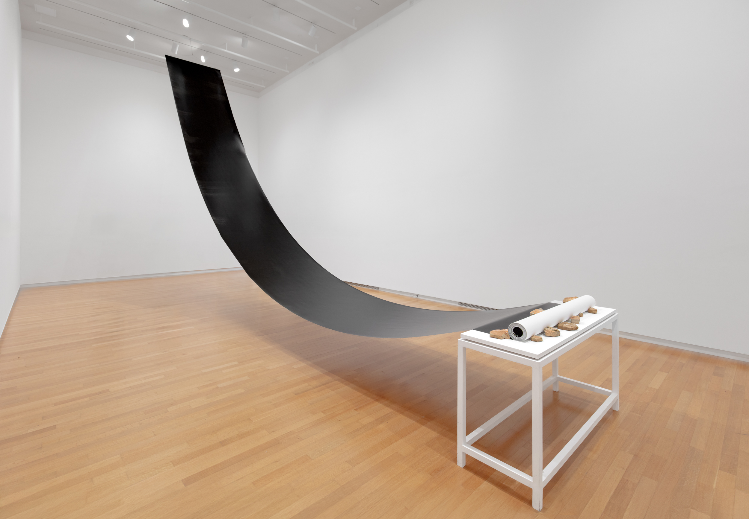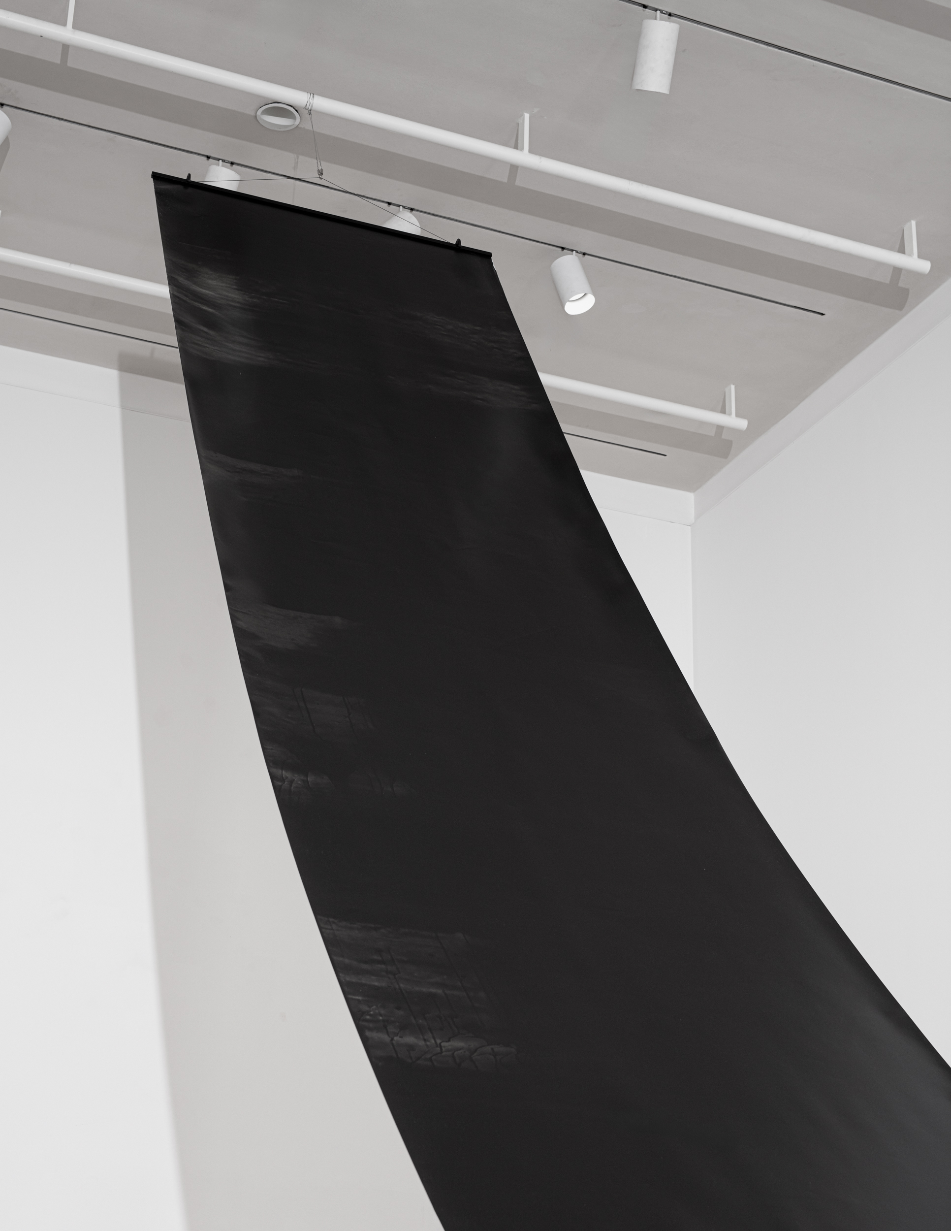 The resulting sun-fused scroll—eventually rendered completely black—functions as an abstract record of exposure, duration, and erasure. By allowing sunlight to overwhelm the surface, the work echoes the original flash that inaugurated the atomic age, while refusing literal representation. The image holds no detail, only aftermath.