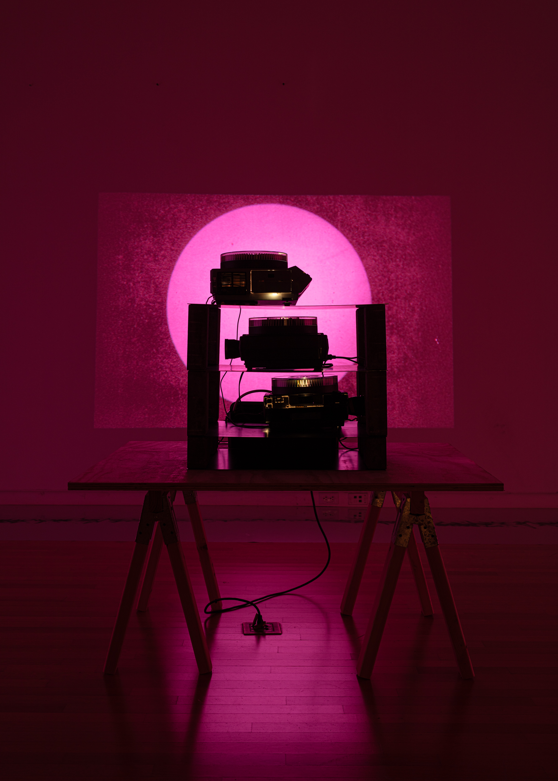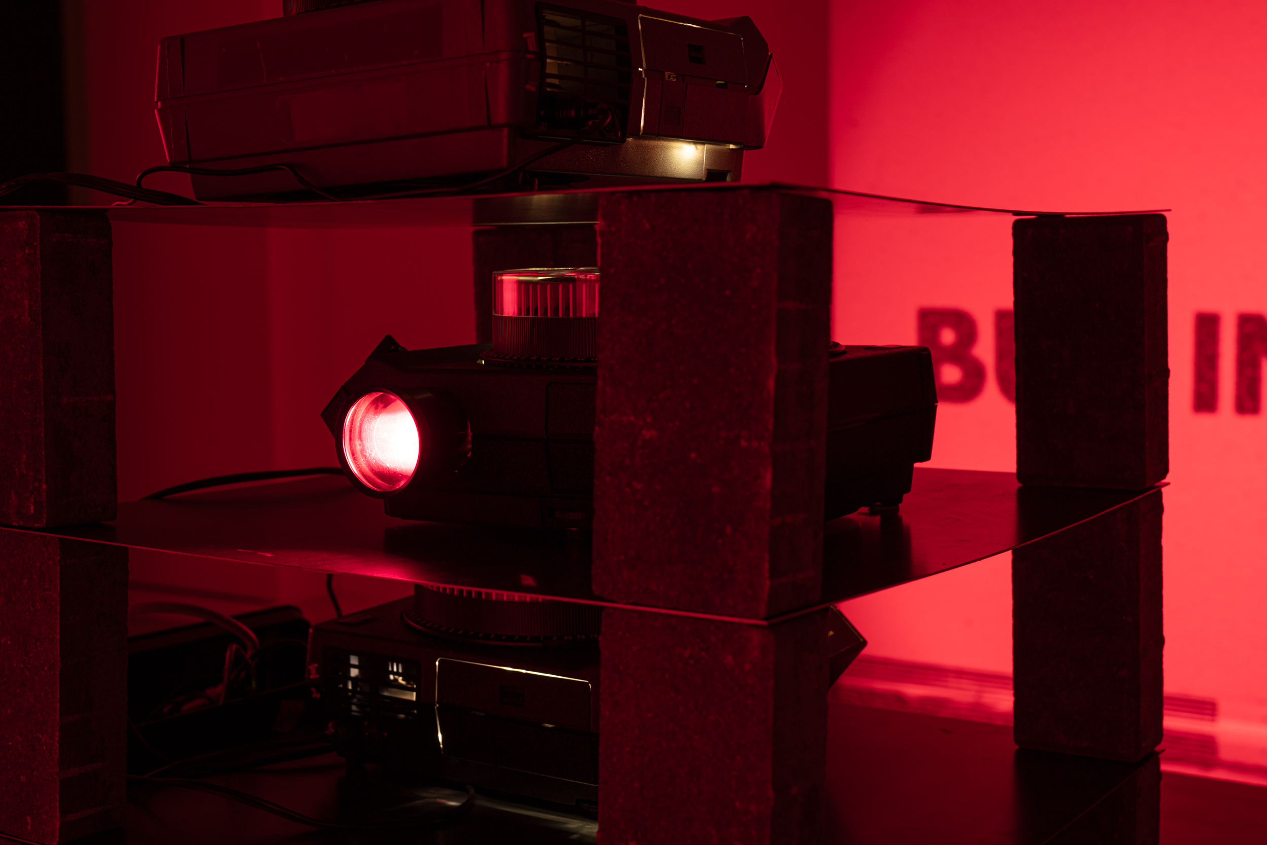 Light Installation (Synchronized Slide Projectors, Arduino, Slide Films, Wooden Table, Steel Plates, Concrete Bricks)