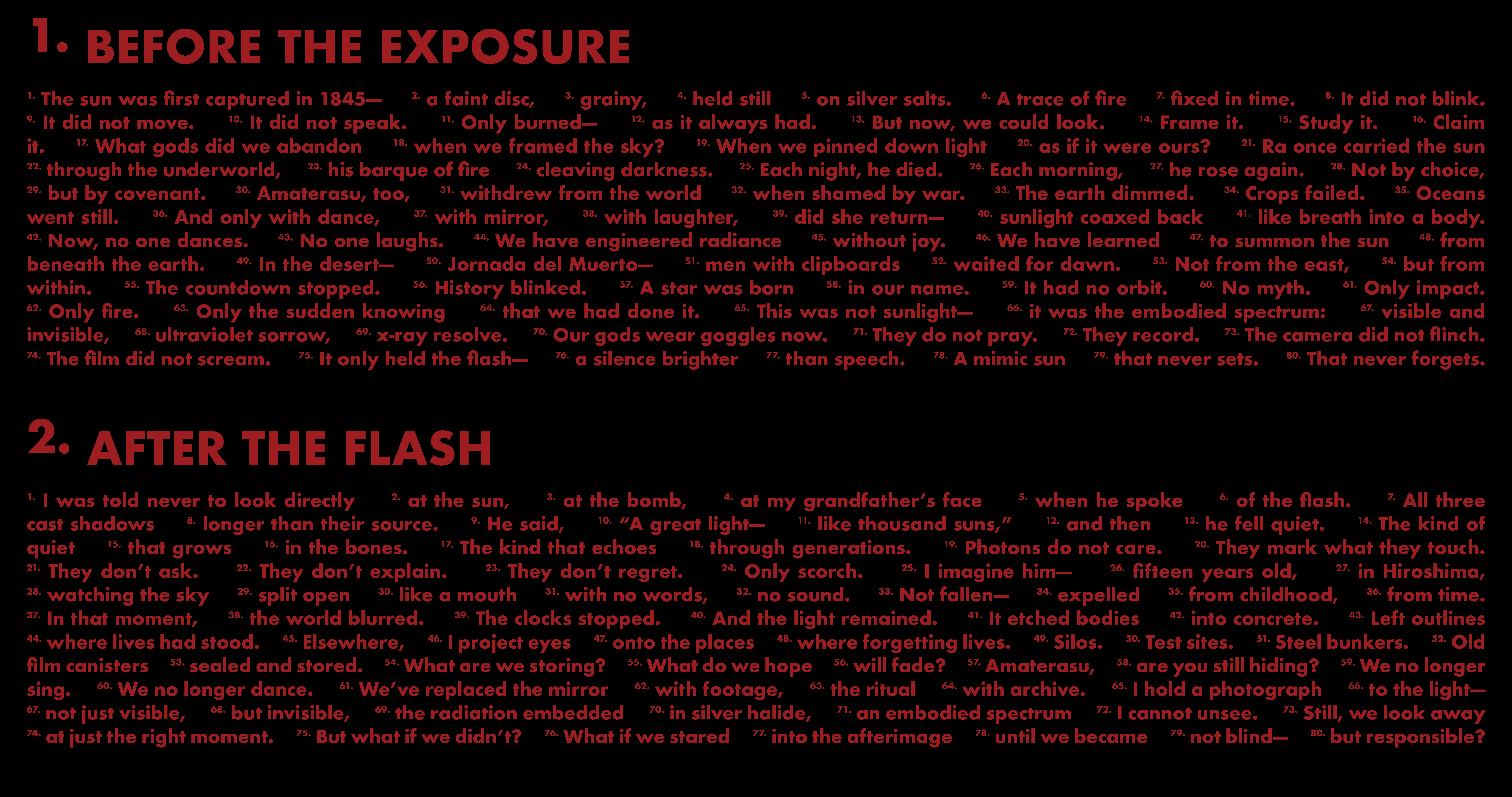 The poetic texts include references to Amaterasu, the Goddess of the Sun in Japanese mythology, and Ra, the Egyptian Sun God. These two beings reflect our relationship with the Sun throughout human history. With the creation of nuclear weapons came the dawn of a new mythology, one centered on human “mastery” of the Sun’s power.