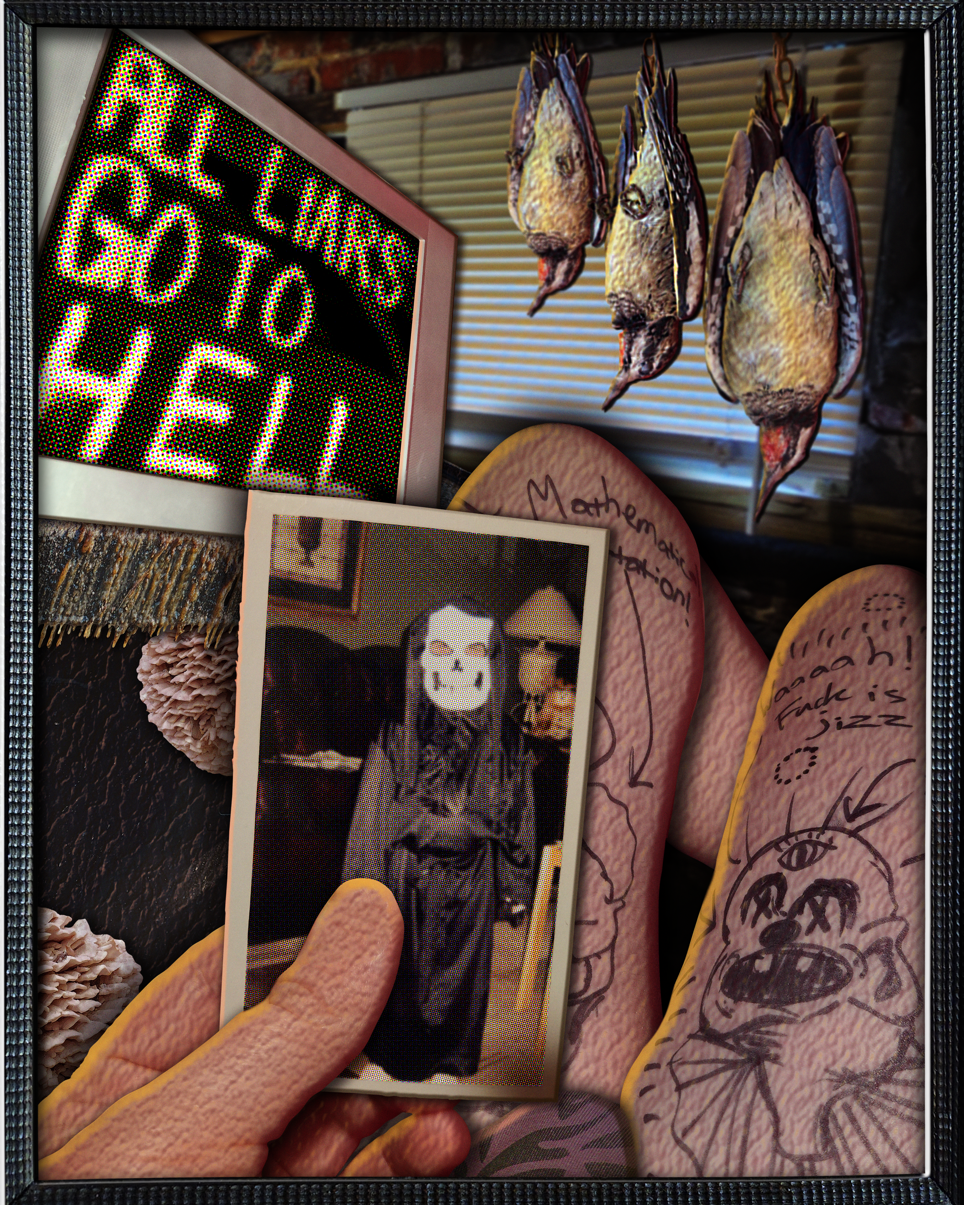 This is a digital collage made from photos taken throughout the last several years as well as a childhood photo of me dressed as the Grim Reaper. Ever since I was a very small child, I've been obsessed with death, what lies beyond it, and the temporary nature of everything living. This fixation has colored many of my earliest, fuzziest memories, as well as much of my day to day life. Completed in November, 2025, this piece is meant to reflect just how deep that unhealthy obsession has serplanted itself within my psyche, taking root within the darkest corners of my mind reserved for intrusive thoughts and things best left forgotten.