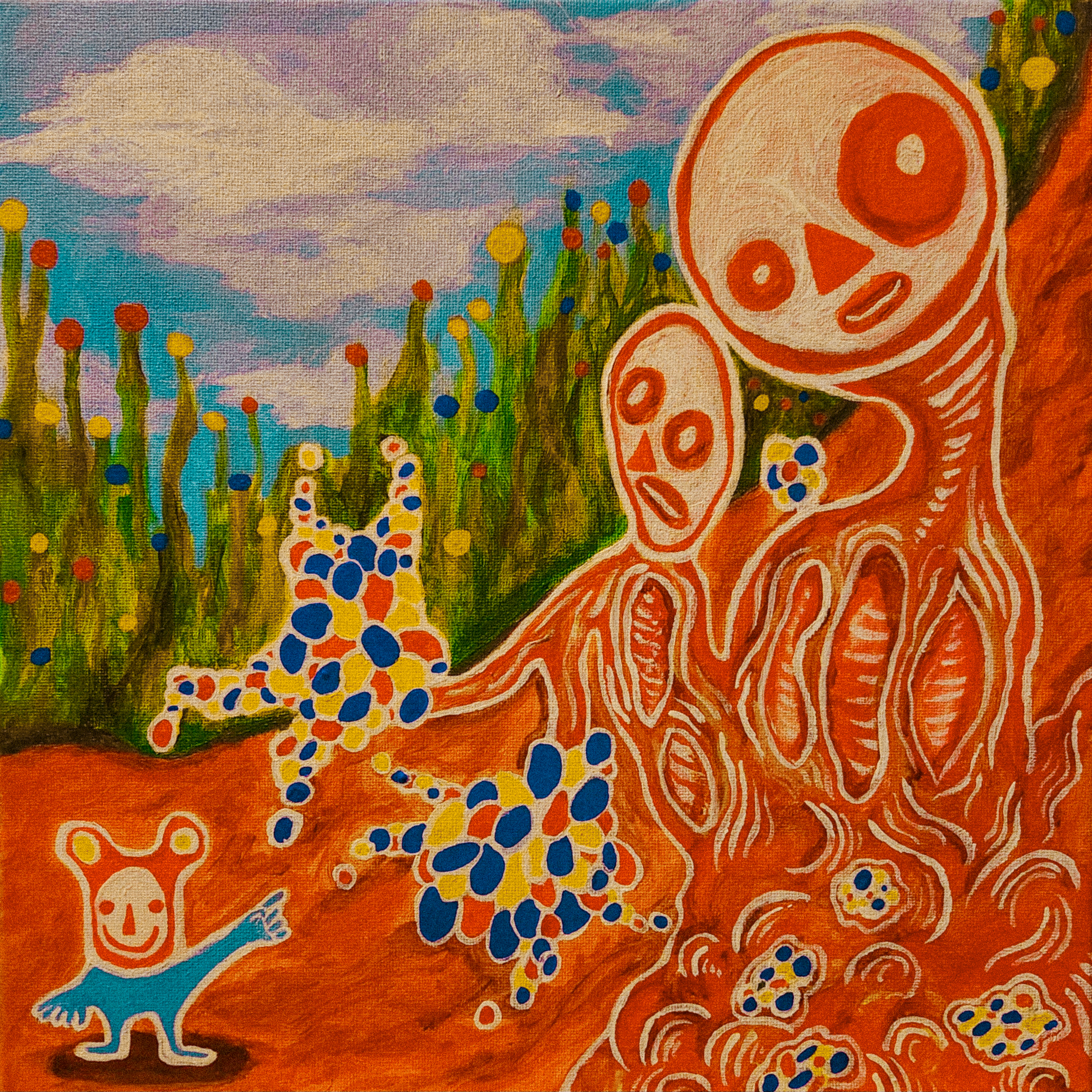 Warm Hugs in Hard Times is an acrylic painting I made in June, 2023 for a album I never finished. It was created in the midst of one of the most emotionally difficult periods of my life, right before I moved to Baltimore once the anti-trans legislation back in Florida really started picking up steam. At the time it served as a comforting escape from the oppressive darkness, ensuring myself that there indeed will always be loved ones to give warm hugs in hard times.