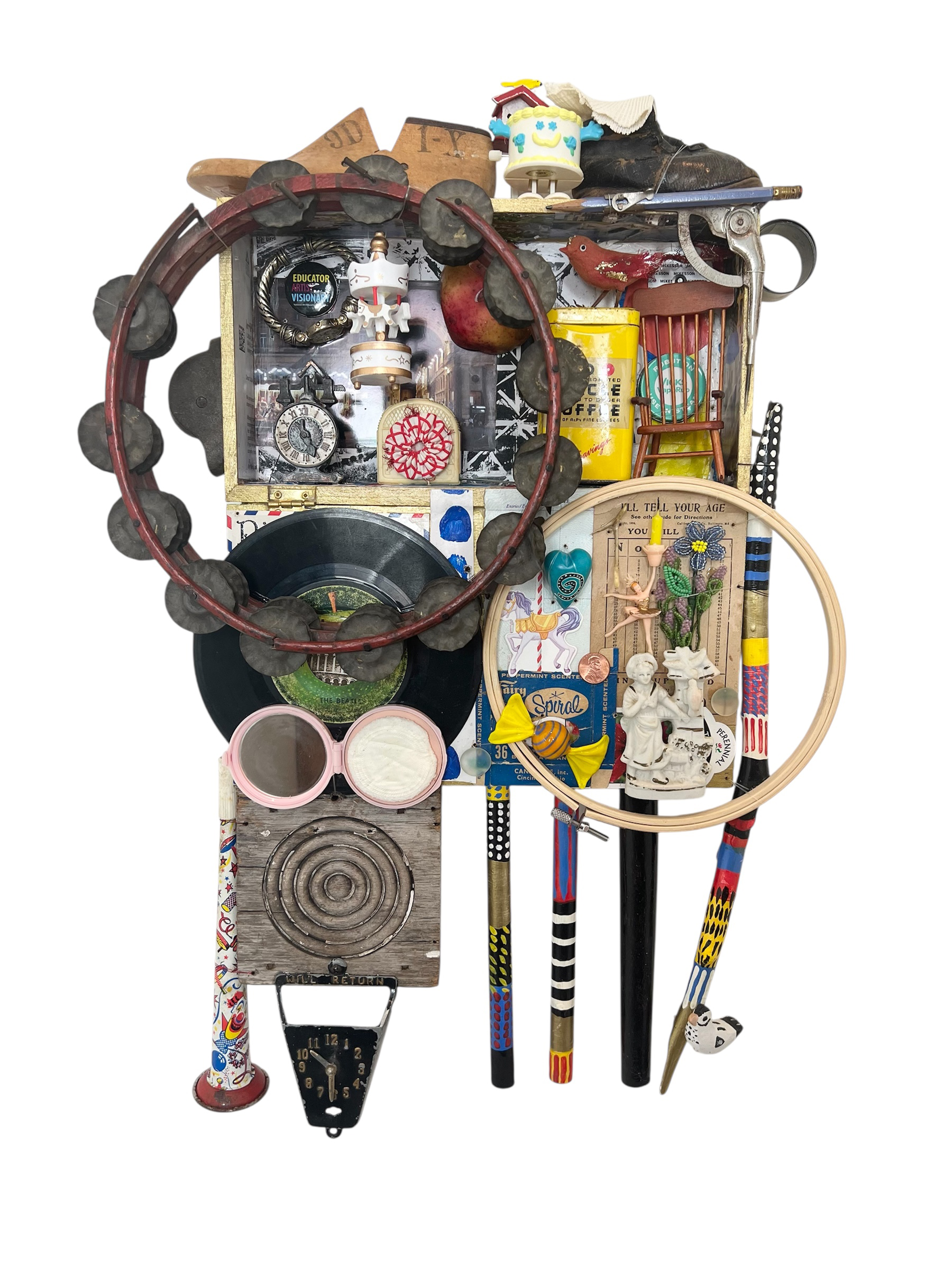 A Jumble Of Small Things Priceless And Worthless A Jumble Of Small Things Priceless And WorthlessA Jumble Of Small Things Priceless And Worthless - 46 x 32 x 5, narrative found object assemblage wall-relief sculpture that I consider my self-portrait over time. The title is an essay by Zora Neale Hurston that resonates with me. She states that we are each a jumble of things. We all put meaning into our treasured momentos. She also thinks that we could all dump our things together, scoop out a new jumble, and still be happy. We can connect with the new things in different ways. This is my hope for my work.......something from my story will cause you to reflect on your own narrative and bring you understanding. Younger viewers can also learn from these objects as they might not know what they are. Maybe an object will remind you of your grandmother and you will give her a call or think of her memory sweetly. The "stilts" are from a world in "Einstein's Dreams" where people felt they could live their longest, best life the further they were from the center of the earth. I am living my best life. Available for PurchaseContact [email protected]