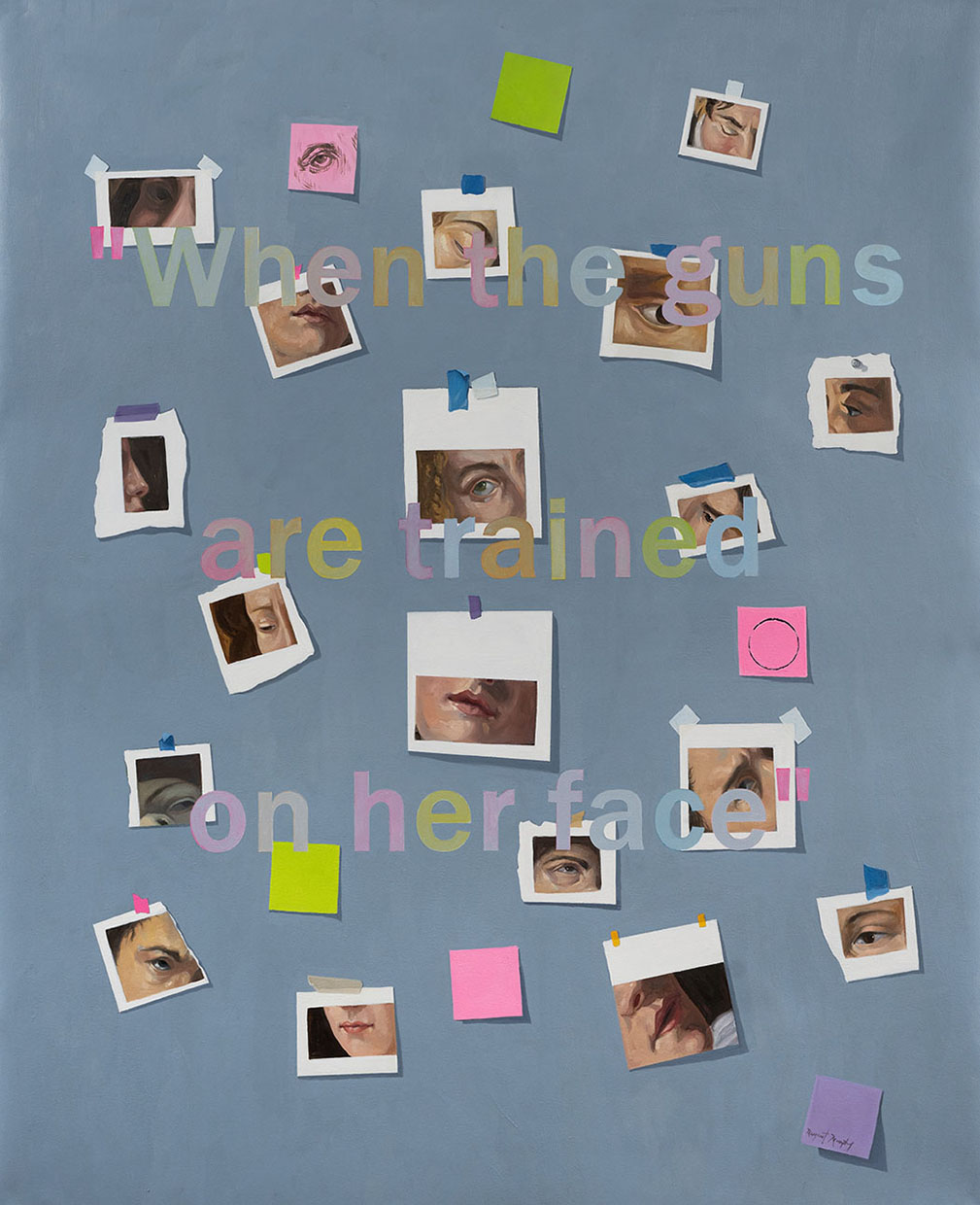 When the guns are trained on her face is a statement made by DonaldTrump about Liz Cheney during the 2025 presidential election. Images are painted in trompe l'oeil to look like torn pieces of paper with fragments of Artemisia Gentileschi paintings of women.