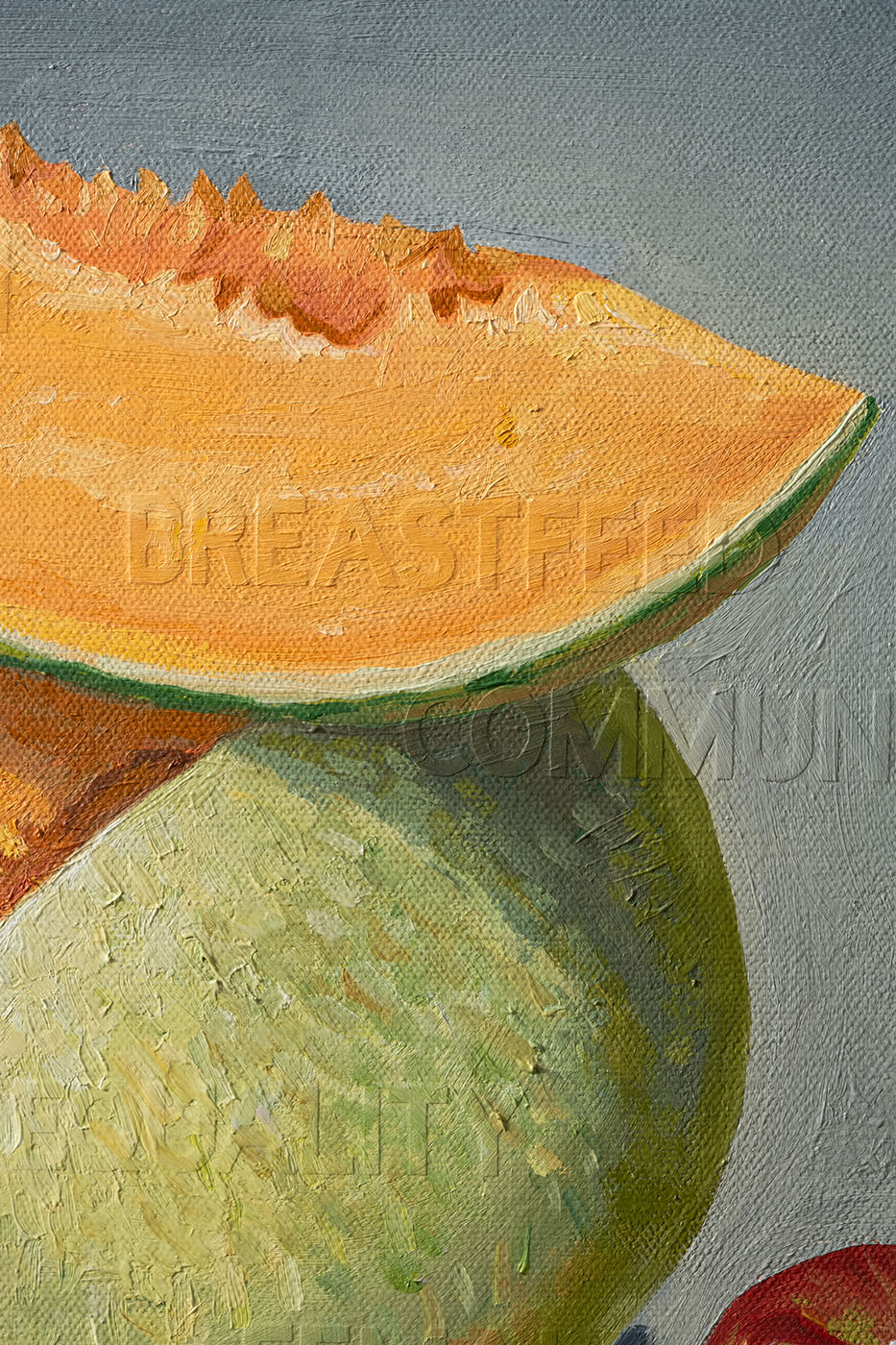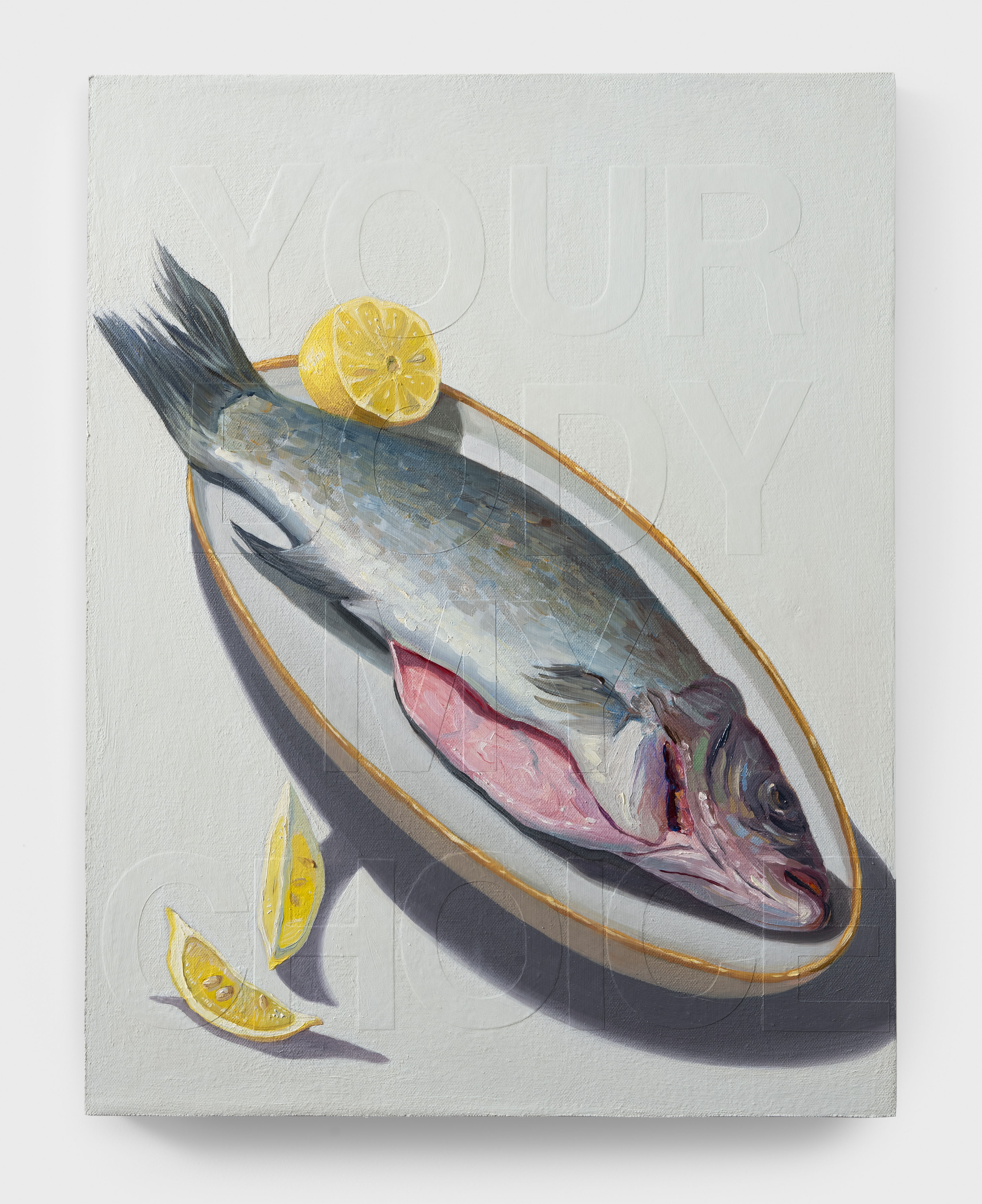 Your Body, My Choice" appropriates a phrase issued by right-wing influencer Nick Fuentes on the social media platform X in the aftermath of the 2024 U.S. presidential election. The statement, a deliberate inversion of pro-choice rhetoric, is embedded within a traditional still life composition modeled after 18th- and 19th-century European domestic genre painting. The arrangement—featuring a fish on a plate—draws upon historical visual tropes associated with mortality, consumption, and domestic ritual. By integrating contemporary political language into a traditional painterly genre, the work invites reflection on ideology, autonomy, and aesthetic heritage, highlighting the enduring mechanisms of control and appropriation in both visual culture and political discourse.