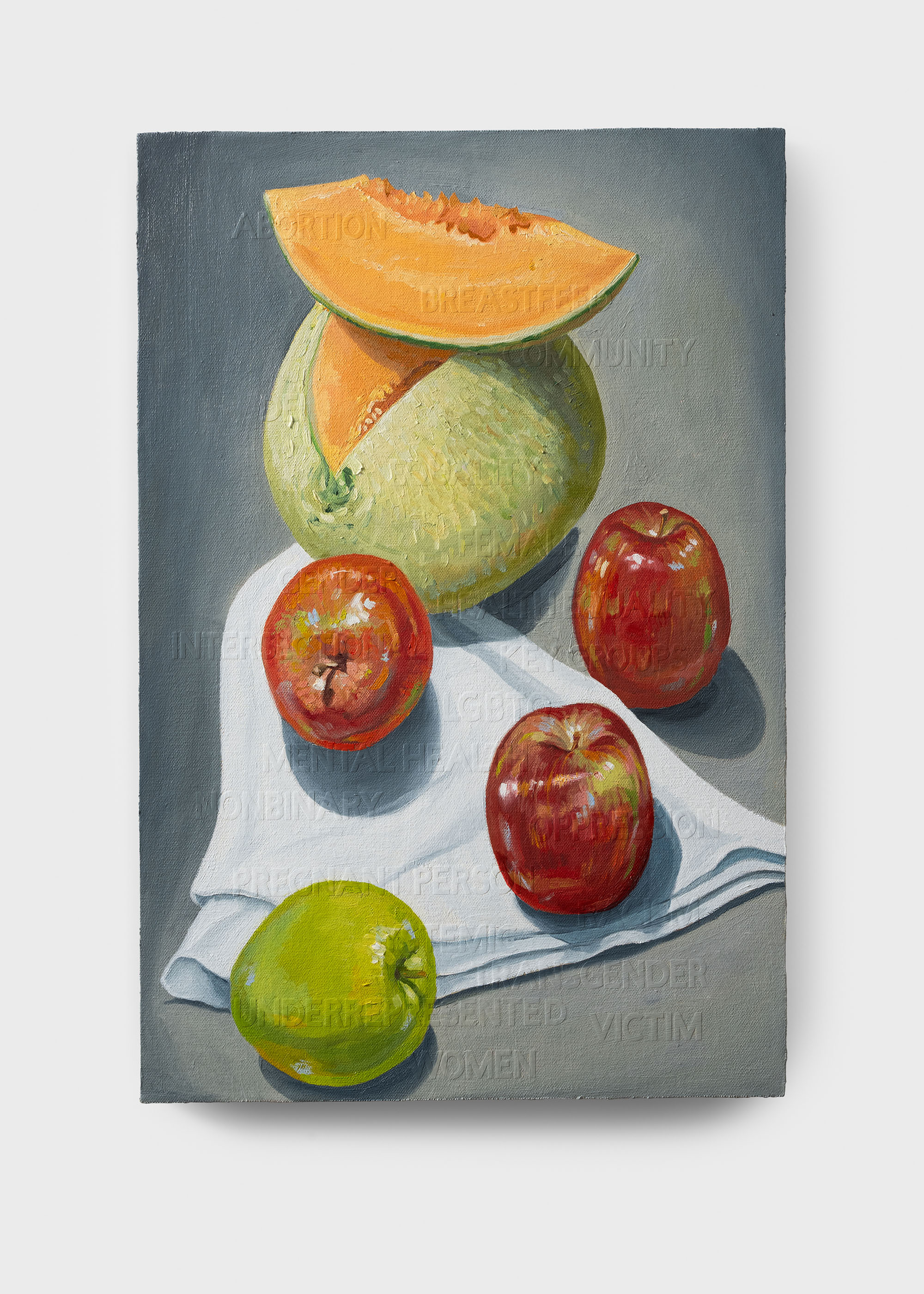 Still life painting reminiscent of an 18th - 19th century painting. Slightly under the surface of the painting is an A-Z list of banned words like breastfeed, equality, woman.
