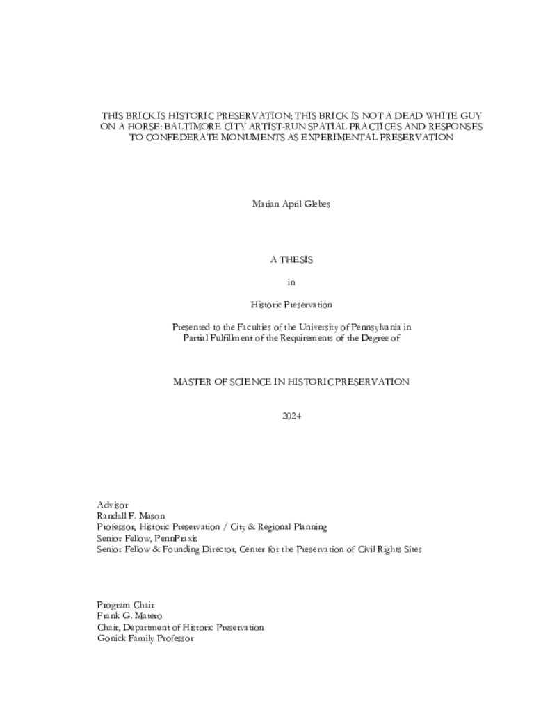 THIS BRICK IS HISTORIC PRESERVATION; THIS BRICK IS NOT A DEAD WHITE GUY ON A HORSE: BALTIMORE CITY ARTIST-RUN SPATIAL PRACTICES AND RESPONSES TO CONFEDERATE MONUMENTS AS EXPERIMENTAL PRESERVATION