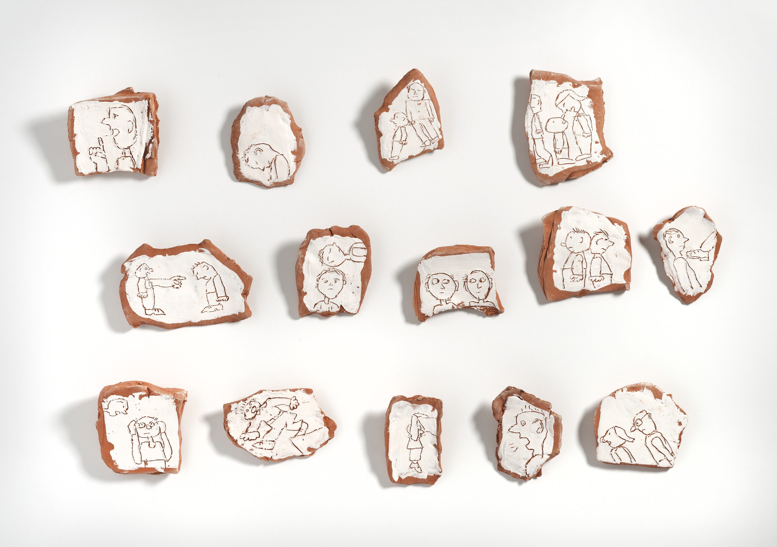 Short Stories That Don't End Well2014, Each approximately 5" x 5", Clay Slip with Sgraffito on Earthenware -