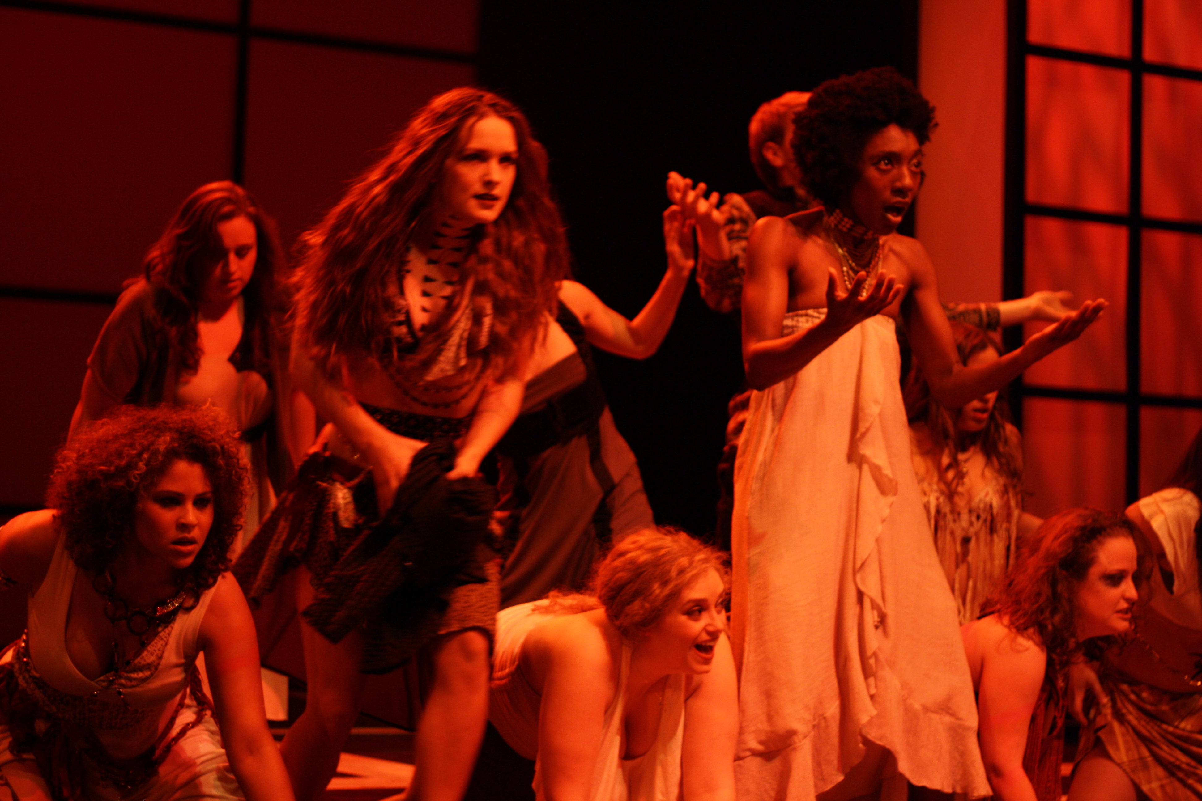 Otherwise, the director wanted the world of Thebes to be one of an urban landscape with a kind of rave underground, and the Bacchae to bring to it an Eastern sensuality. It so happened that one of the cast members was an expert belly dancer, so I employed her as assistant choreographer. The whole cast added some basic belly dance vocabulary to their repertoire, and we were able to blend this with the other flavors we were working with in different moments of the chorus' movement.