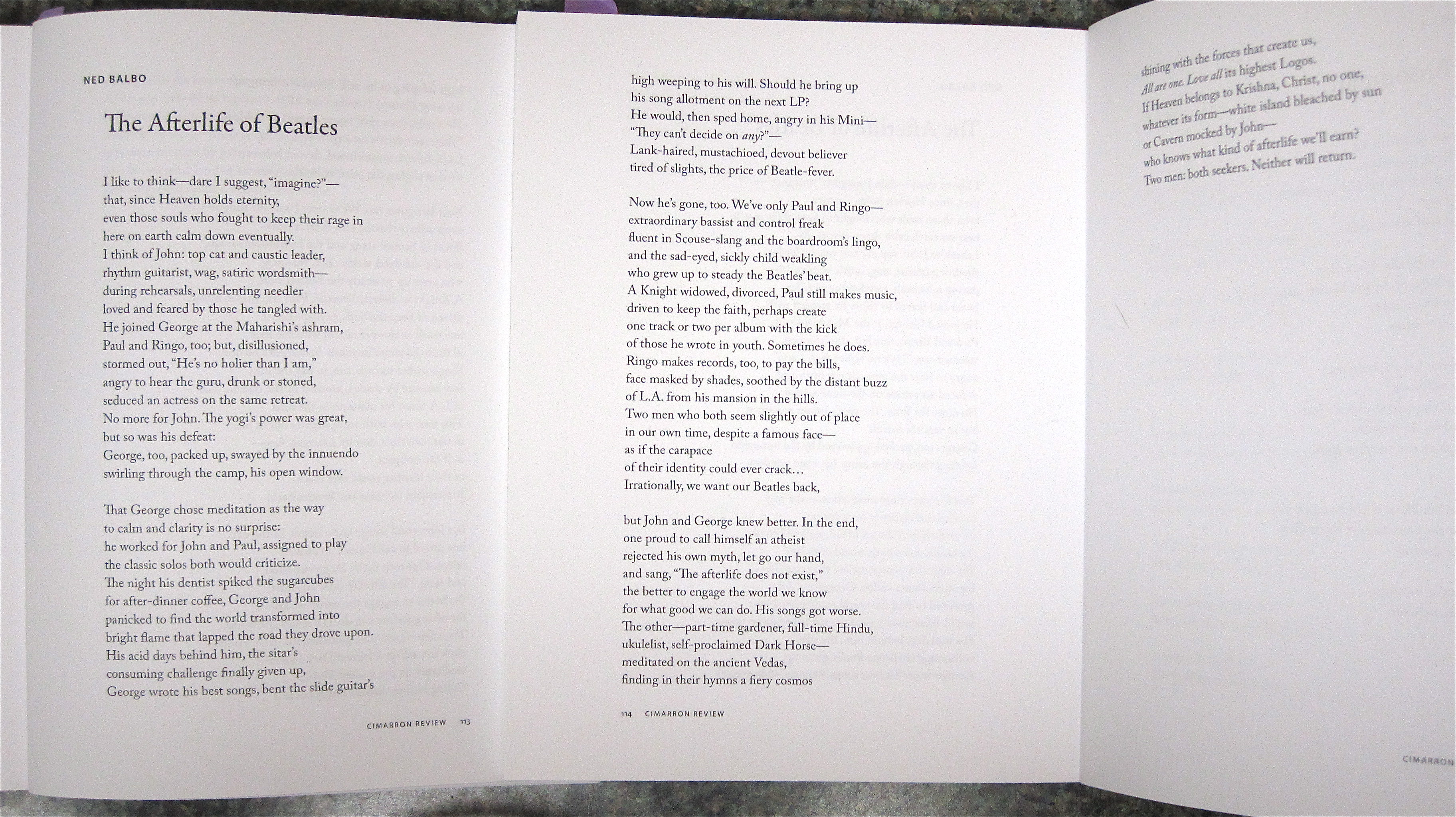The Afterlife of Beatles, Cimarron Review, Summer 2012Here I tried to capture each Beatle's personality in a single stanza while tracing the arc of their separate lives, including those that ended too soon. These are sonnet stanzas with extra lines (one short) added. -