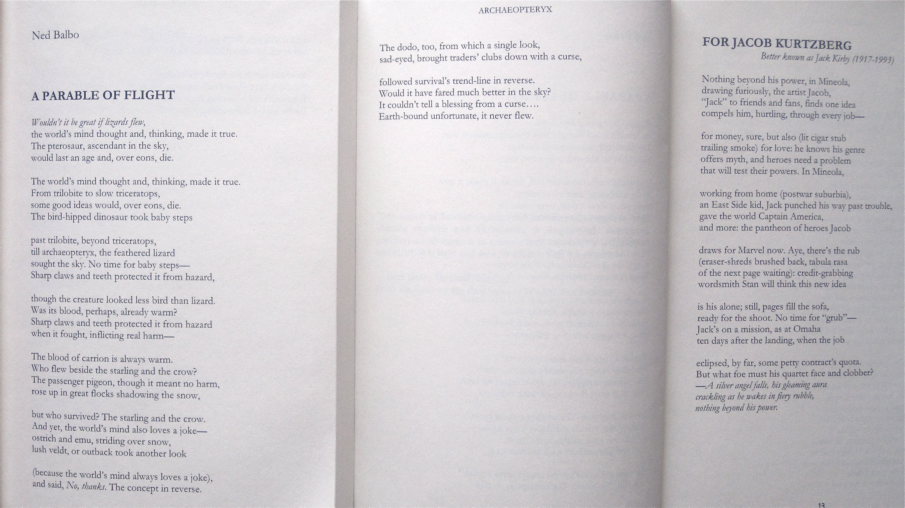 Two poems from Archaeopteryx: the Newman Journal of Ideas, 2012."For Jacob Kurtzberg": Background on the life and career of comics giant Jack Kirby is drawn from The Comics Journal Library, Volume One: Jack Kirby (Fantagraphics, 2002). Kirby co-created Captain America with Joe Simon prior to the U.S. entry into WWII. Kirby’s collaborator and editor during the 1960’s (and co-creator of the Marvel Universe) was Stan Lee. The “fallen angel” is the Silver Surfer, herald of world-devouring Galactus. This is a rondeau redoubled: a piece of the first line becomes the poem's last line, and each line in stanza one gets its turn to become the last line of the stanzas that follow. I vary the refrain lines. -